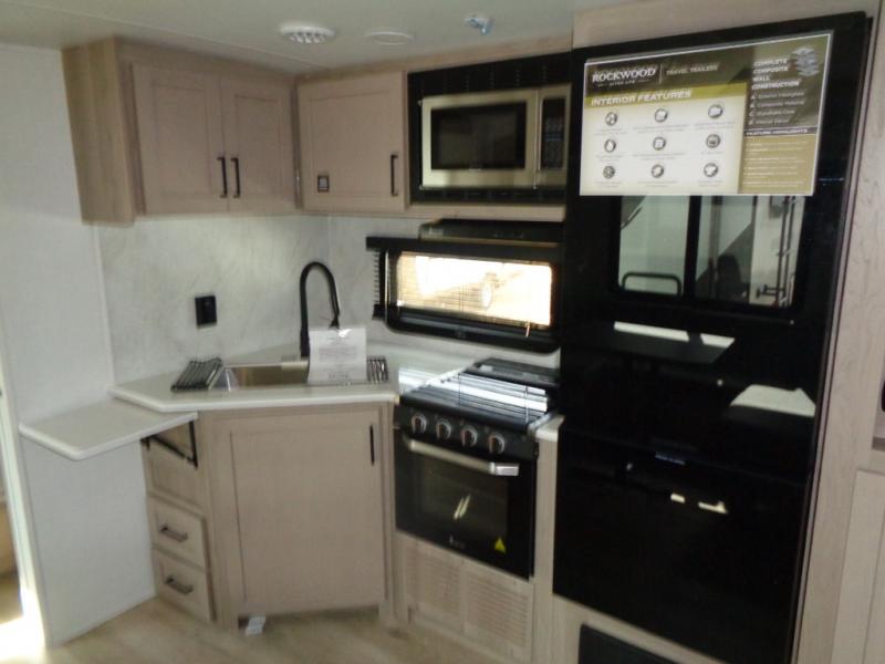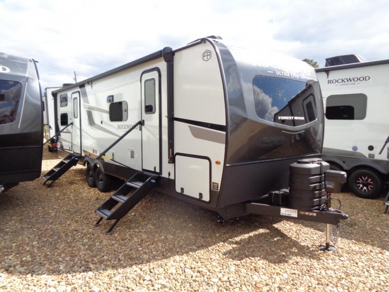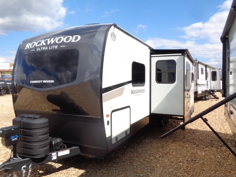 Each Rockwood Ultra Lite travel trailer by Forest River includes superior construction with a high gloss fiberglass cap, aluminum cage construction, and a power awning with LED lighting for a cozy and functional outdoor space. The torsion axle, power tongue jack will make towing smooth and hassle-free, along with the nitrogen filled, Goodyear Endurance tires and the tire pressure monitor system. Interior comforts include kitchen sink with high rise faucet, hidden hinge cabinet doors, and roller shades to name a few. Choose a Rockwood Ultra Lite travel trailer today!