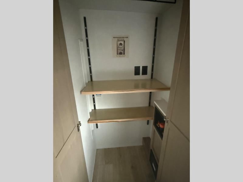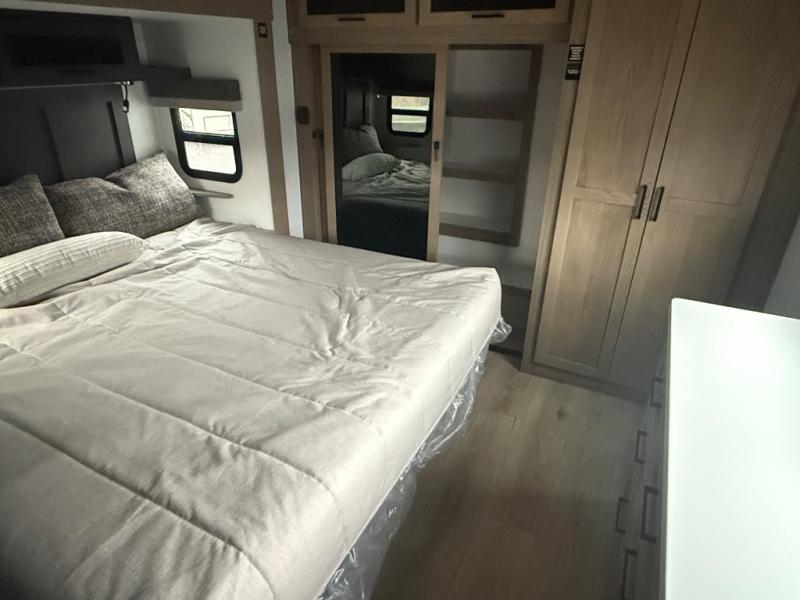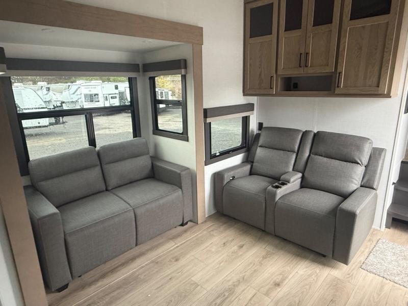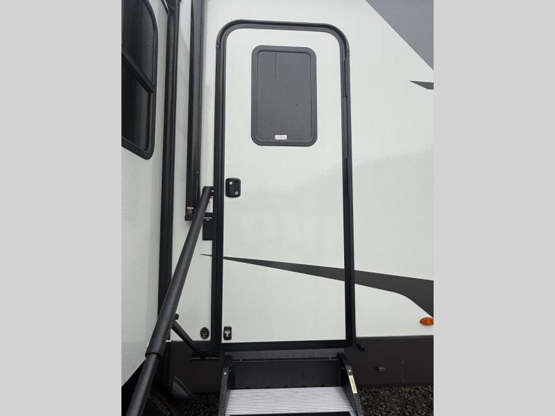 This rear kitchen fifth wheel is the perfect coach for a couple, or one that likes to entertain overnight guests. With two hide-a-bed sofas, one 60" and the other 68", you will have plenty of room for taking along extra family or friends on your adventures. The kitchen is tucked in the back and features a u-shaped counter area, and there is a table, chairs & bench within the slide that houses the 68" HAB sofa. You could also choose the optional theater seating in place of this hide-a-bed if you don't need the extra sleeping space. There is also a 60" theater seat for movie night opposite the TV/fireplace. Head up the steps to your private front bedroom with slide out queen bed, dresser, and large wardrobe with washer and dryer prep. The bathroom is at the top of the steps up and includes a large shower, linen cabinet and sink, plus a toilet. This unit also features ample storage on the outside as well as on the interior.