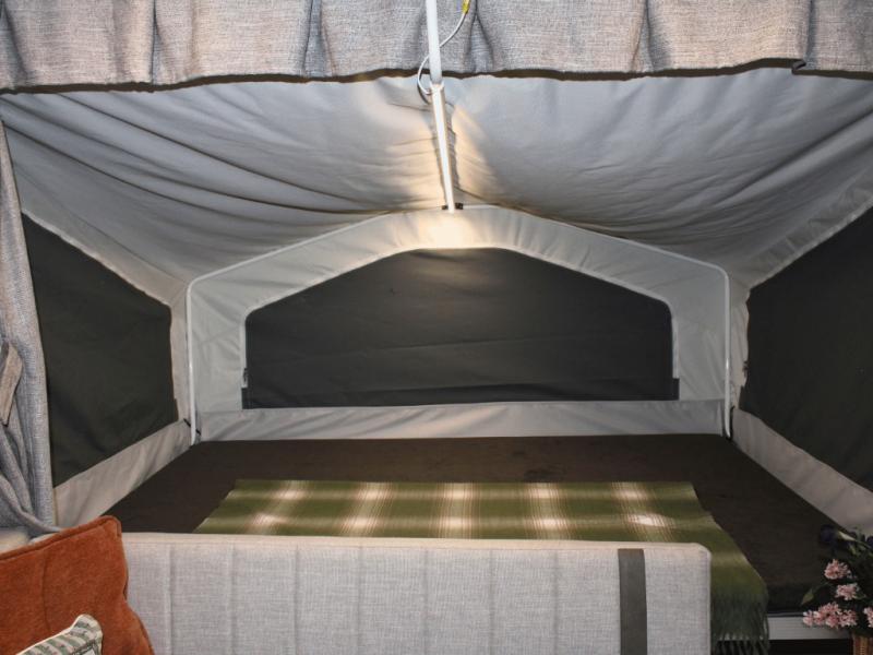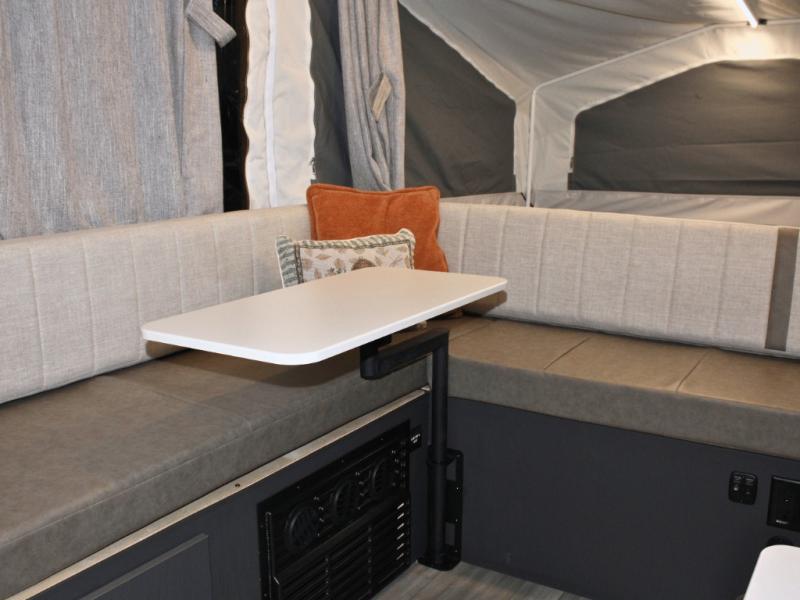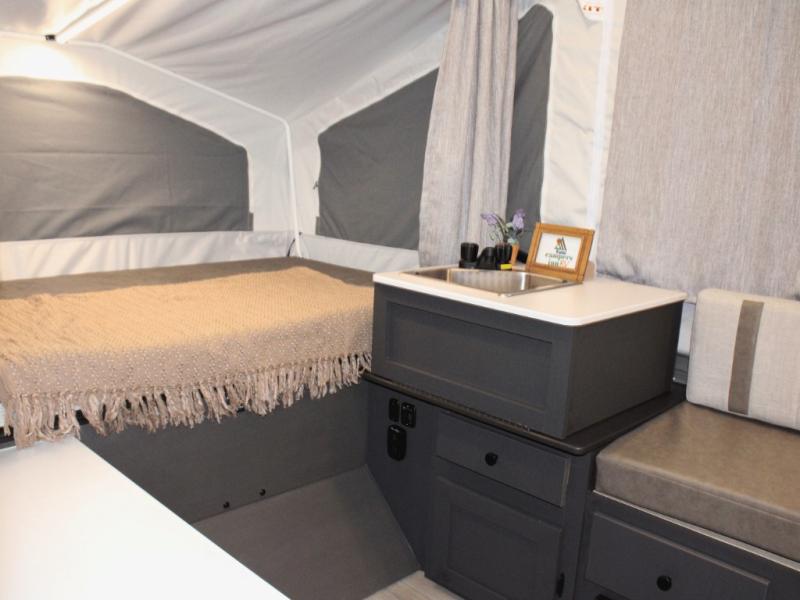 Inside, you’ll find two spacious tent end beds that provide comfortable sleeping areas after a full day of adventure. The L-shaped seating with table creates a welcoming space for meals, games, or planning the next day’s activities, and it can double as extra sleeping space for guests or kids at night. A convenient indoor sink makes washing dishes and brushing your teeth quick and easy, while the 12V refrigerator keeps food and drinks fresh throughout your trip.