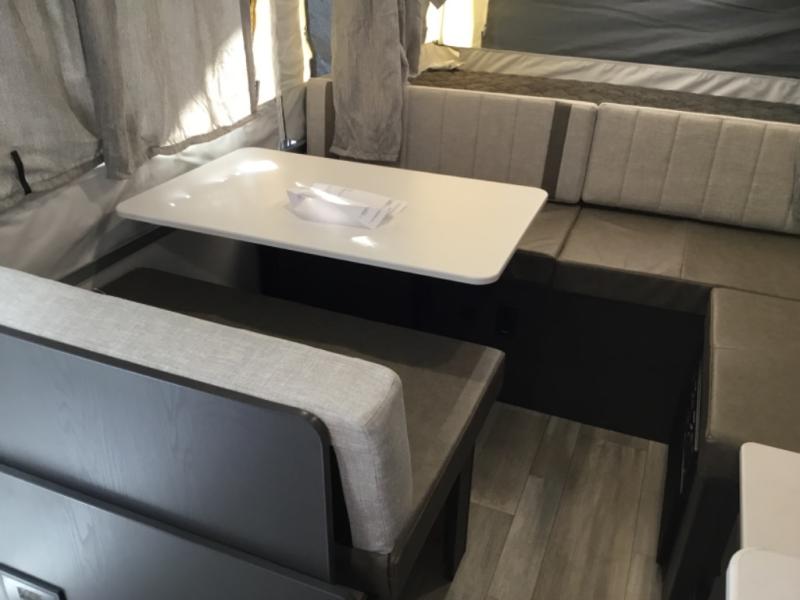 This Rockwood Freedom Series folding pop-up camper is going to let you camp in freedom! You will be able to use the permanently mounted three burner range to cook up some delicious food, and the 9' awning with an LED light will keep you protected while you work. You will also find that the booth dinette with added seating will be useful for both meal time and bed time when the two tent end beds aren't enough space, and the storage lid under the front bed provides storage for luggage, blankets, and more!