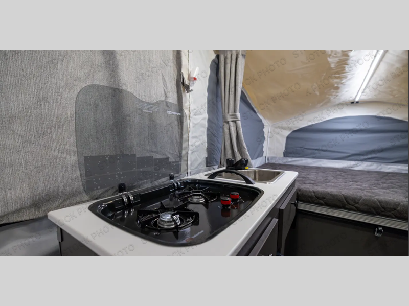 This Rockwood Freedom Series folding pop-up camper is going to let you camp in freedom! You will be able to use the permanently mounted three burner range to cook up some delicious food, and the 9' awning with an LED light will keep you protected while you work. You will also find that the booth dinette with added seating will be useful for both meal time and bed time when the two tent end beds aren't enough space, and the storage lid under the front bed provides storage for luggage, blankets, and more!