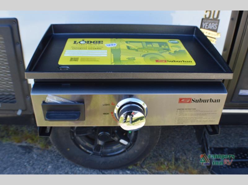This Rockwood Freedom Series folding pop-up camper is going to let you camp in freedom! You will be able to use the outdoor griddle to cook up some delicious food, and the 9' awning with an LED light will keep you protected while you work. You will also find that the booth dinette will be useful for both meal time and bed time when the two tent end beds aren't enough space, and the storage lid under the front bed provides storage for luggage, blankets, and more!
