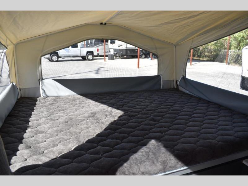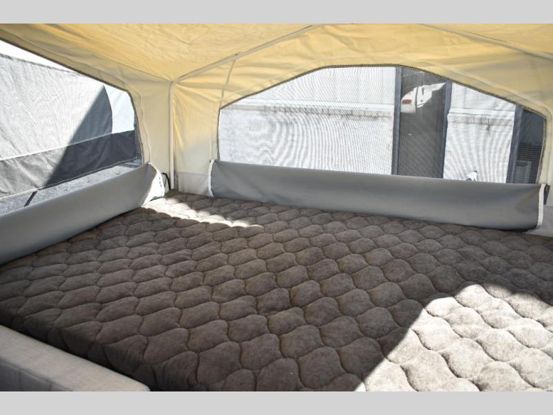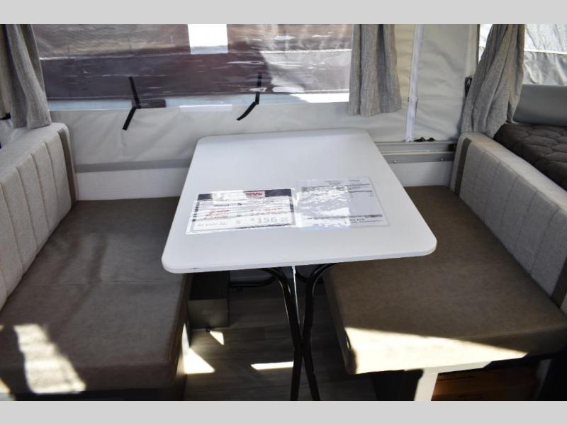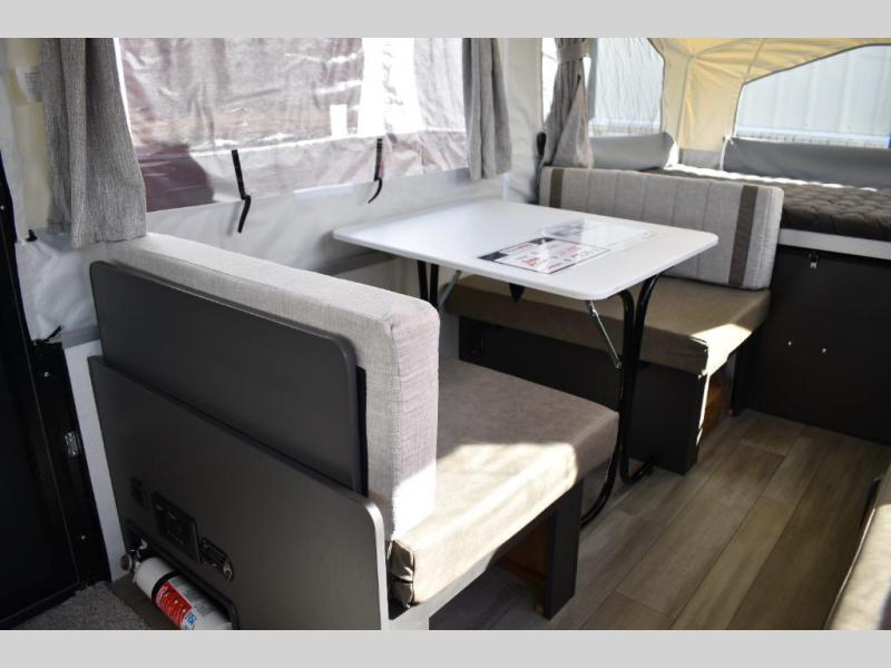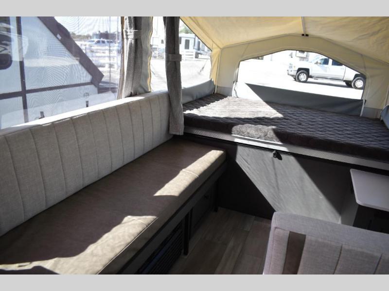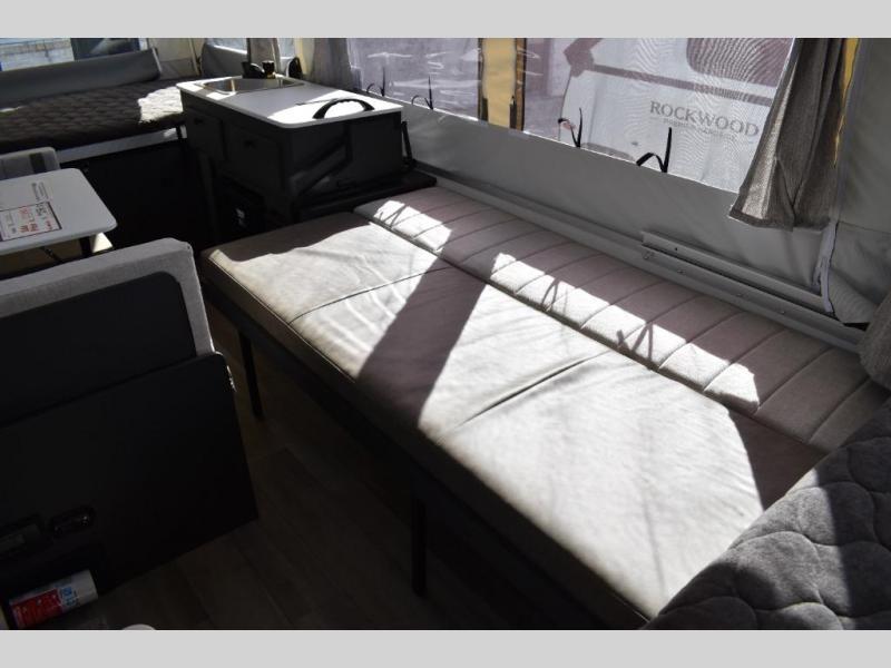 This Rockwood Freedom Series folding pop-up camper is going to let you camp in freedom! You will be able to use the outdoor griddle to cook up some delicious food, and the 9' awning with an LED light will keep you protected while you work. You will also find that the booth dinette will be useful for both meal time and bed time when the two tent end beds aren't enough space, and the storage lid under the front bed provides storage for luggage, blankets, and more!