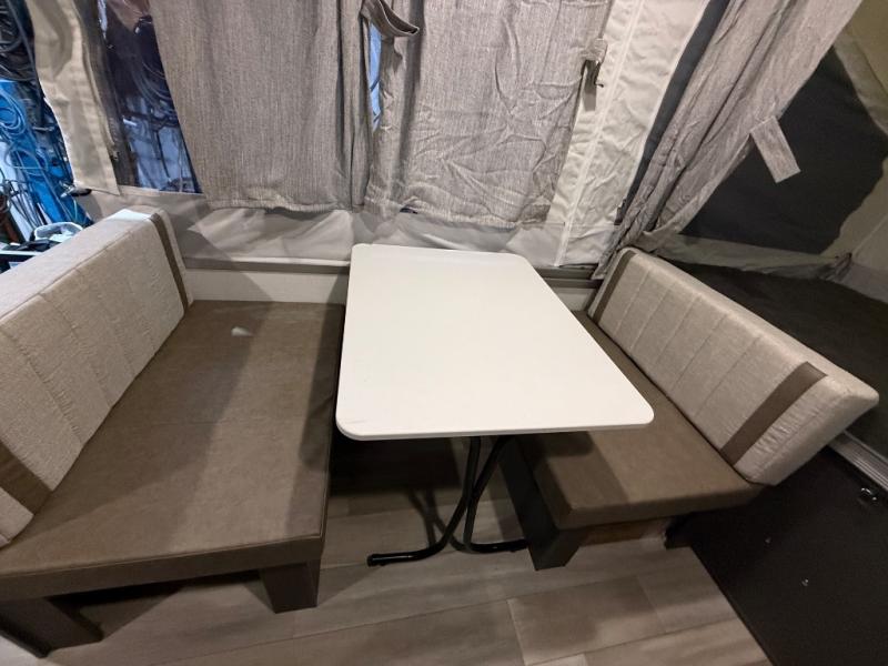 This Rockwood Freedom Series folding pop-up camper is going to let you camp in freedom! You will be able to use the outdoor griddle to cook up some delicious food, and the 9' awning with an LED light will keep you protected while you work. You will also find that the booth dinette will be useful for both meal time and bed time when the two tent end beds aren't enough space, and the storage lid under the front bed provides storage for luggage, blankets, and more!