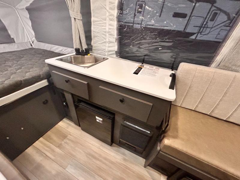 With any Rockwood Freedom Series by Forest River, you will enjoy added features to make each excursion one to remember. These folding pop-up campers feature a fiberglass laminated roof, wood plank flooring, and a two tone fiberglass exterior. The Dexter sprung axles, electric brakes, and radial tires with nitrogen will make towing easier than ever, plus there are four stabilizer jacks with sand pads to help keep your unit secure. Each model also includes an awning with LED lighting outdoors, along with a one-piece screen door, two 20 lb. LP bottles, and a power roof lift to have you set up in no-time. Inside, the 15K under-bunk A/C and 20K BTU furnace will help keep you comfortable, and the Maxxair fan will keep the air moving!