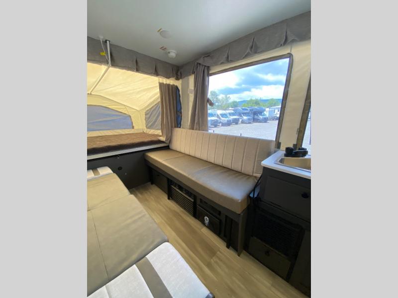 This Rockwood Freedom Series folding pop-up camper is going to let you camp in freedom! You will be able to use the outdoor griddle to cook up some delicious food, and the 11' awning with an LED light will keep you protected while you work. You will also find that the booth dinette will be useful for both meal time and bed time when the two tent end beds aren't enough space, along with the gaucho bed. This camper also includes a front deck storage with expanded metal decking for all your camping gear!