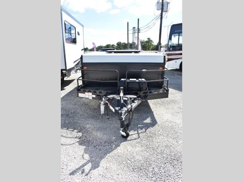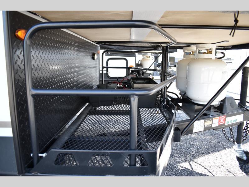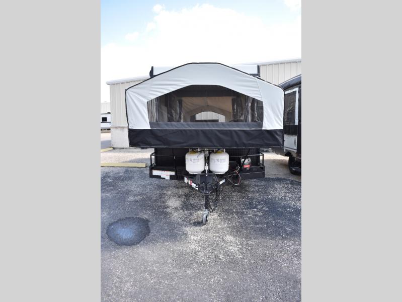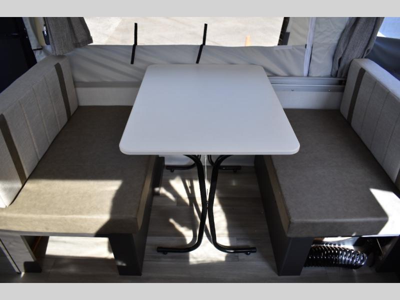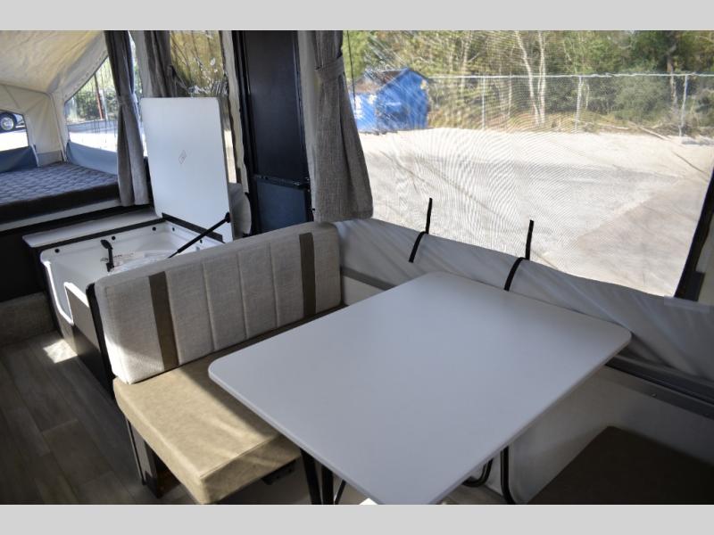 This Rockwood Freedom Series folding pop-up camper is going to let you camp in freedom! You will be able to use the outdoor griddle to cook up some delicious food, and the 11' awning with an LED light will keep you protected while you work. You will also find that the booth dinette will be useful for both meal time and bed time when the two tent end beds aren't enough space, along with the gaucho bed. This camper also includes a front deck storage with expanded metal decking for all your camping gear!