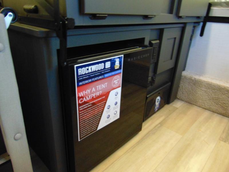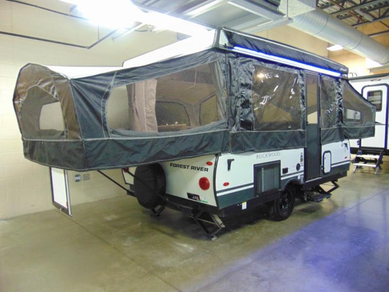 With any Rockwood Freedom Series by Forest River, you will enjoy added features to make each excursion one to remember. These folding pop-up campers feature a fiberglass laminated roof, wood plank flooring, and a two tone fiberglass exterior. The Dexter sprung axles, electric brakes, and radial tires with nitrogen will make towing easier than ever, plus there are four stabilizer jacks with sand pads to help keep your unit secure. Each model also includes an awning with LED lighting outdoors, along with a one-piece screen door, two 20 lb. LP bottles, and a power roof lift to have you set up in no-time. Inside, the 15K under-bunk A/C and 20K BTU furnace will help keep you comfortable, and the Maxxair fan will keep the air moving!