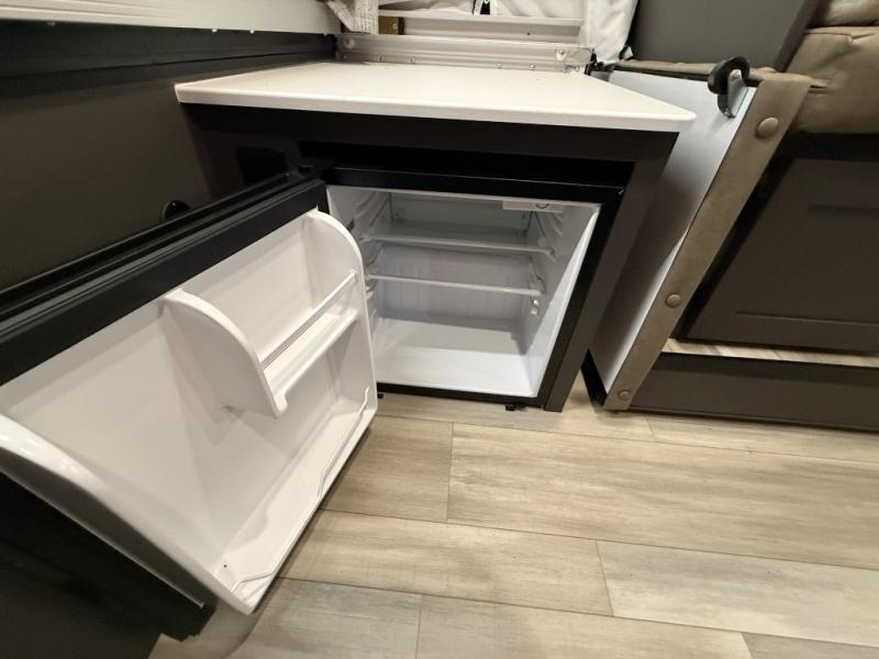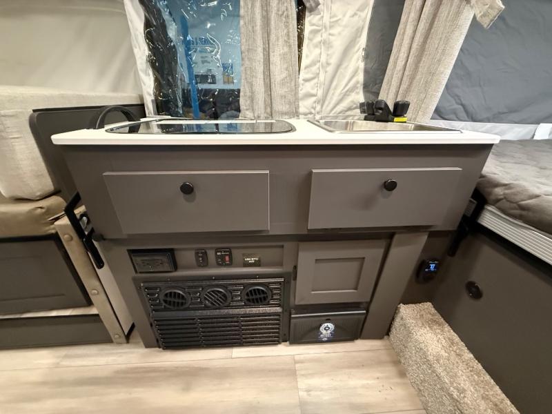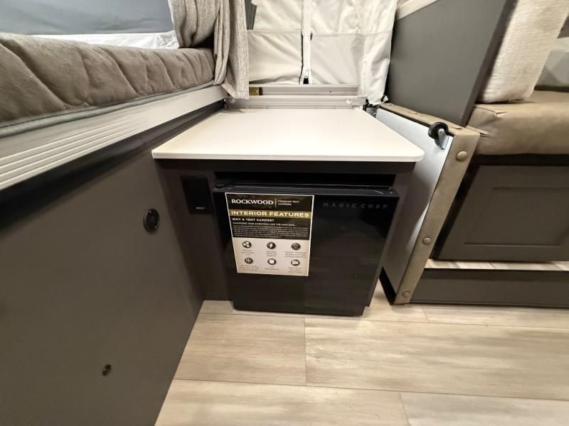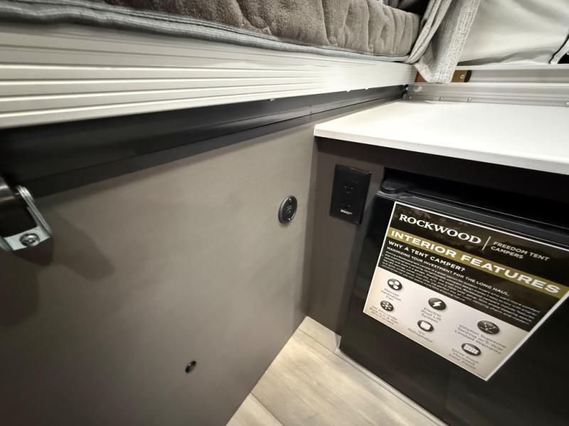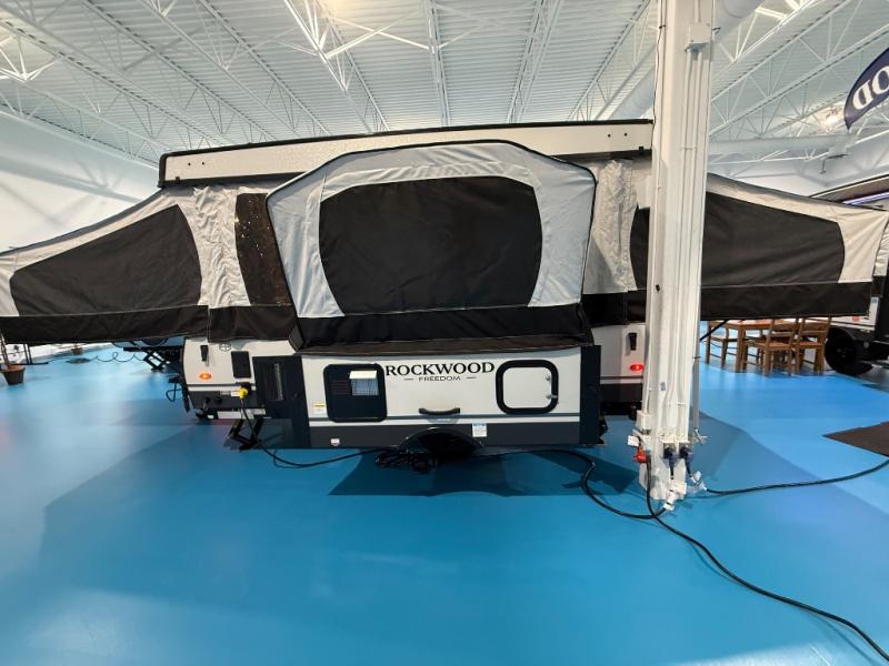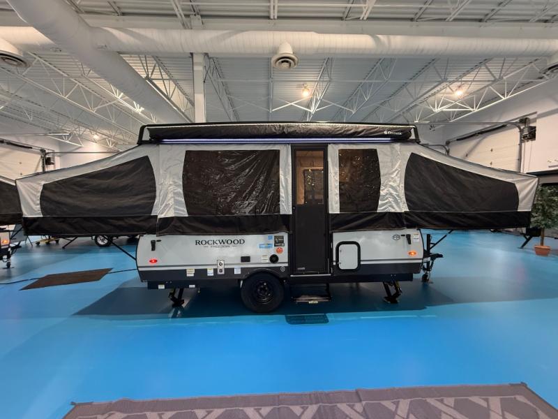 With any Rockwood Freedom Series by Forest River, you will enjoy added features to make each excursion one to remember. These folding pop-up campers feature a fiberglass laminated roof, wood plank flooring, and a two tone fiberglass exterior. The Dexter sprung axles, electric brakes, and radial tires with nitrogen will make towing easier than ever, plus there are four stabilizer jacks with sand pads to help keep your unit secure. Each model also includes an awning with LED lighting outdoors, along with a one-piece screen door, two 20 lb. LP bottles, and a power roof lift to have you set up in no-time. Inside, the 15K under-bunk A/C and 20K BTU furnace will help keep you comfortable, and the Maxxair fan will keep the air moving!