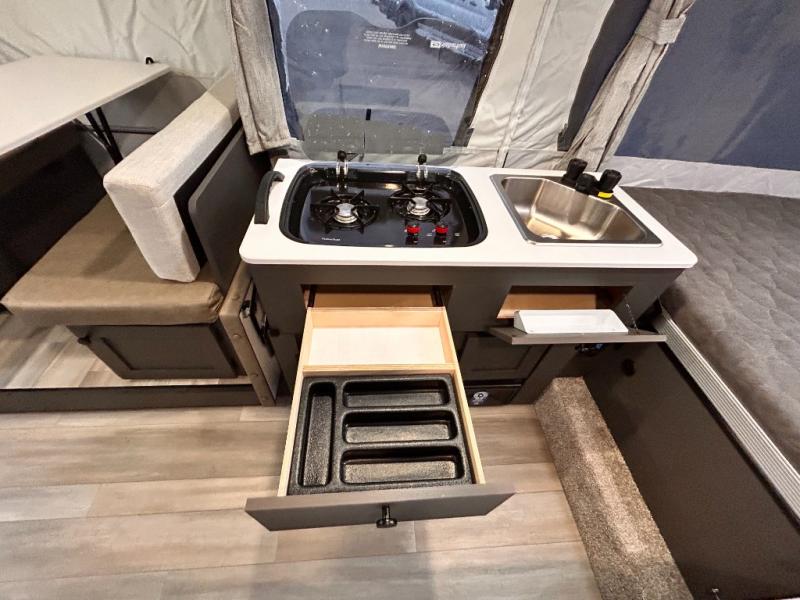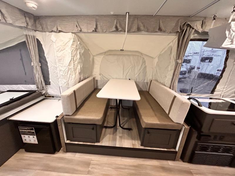 You won't have to worry about length restrictions or cumbersome towing because this Rockwood Freedom Series folding pop-up camper provides you with a lightweight and flexible alternative to heavy RVs! This camper has a single slide built into it which will deliver extra space to the interior without adding to the overall width while traveling, and the booth dinette is a functional piece of furniture that can serve as a dining table and a bed. The swing galley includes a two burner range with a cover to cook meals and a sink for easy cleaning. There is also a shower/toilet to make this unit even more convenient.