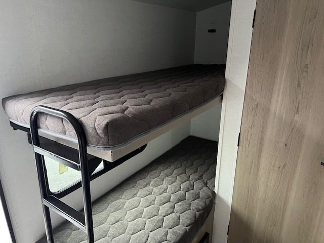 Perfect for couples, families, or friends, this trailer offers a comfortable and functional space to relax, recharge, and explore. The full bathroom is a serene retreat, equipped with everything you need to refresh and rejuvenate after a day of adventure. The two bunk beds give a snug and inviting sleeping spot, perfect for kids or adults looking for a cozy spot to rest. The kitchen is equipped with a microwave for quick and easy meal prep, and a fridge to keep your favorite snacks and drinks fresh. Overhead cabinets provide plenty of storage for your gear, cookware, and essentials, keeping your trailer tidy and organized. The bed offers a restful sleeping space, perfect for unwinding after a long day of exploring.