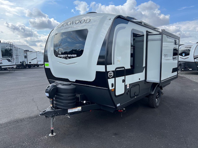With any Rockwood GEO Pro travel trailer by Forest River you will enjoy easy towing, durable construction, and off-road capabilities with larger 15" tires and a lift kit! Each model is constructed with complete composite wall construction for added strength and durability, and the torsion axle, Rubber-Ryde suspension will make towing easier than ever. Inside, you'll find sleek roller shades for added privacy, a 12V refrigerator and a microwave, plus a 20,000 BTU furnace to keep you warm during the colder camping months.