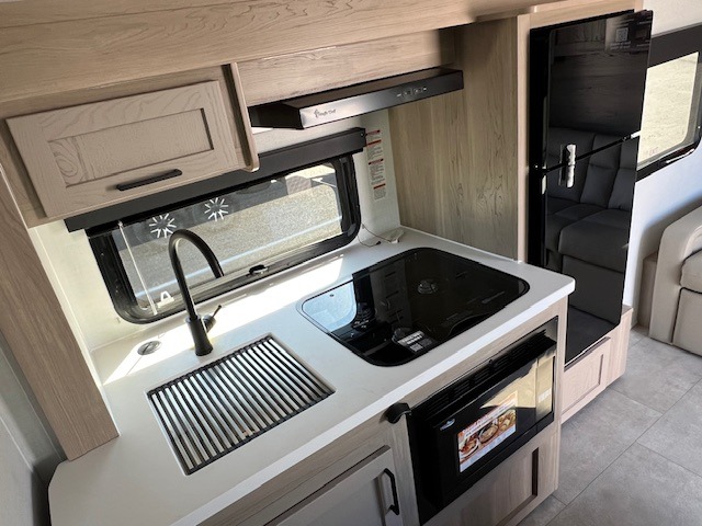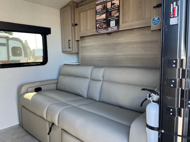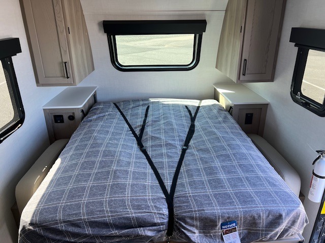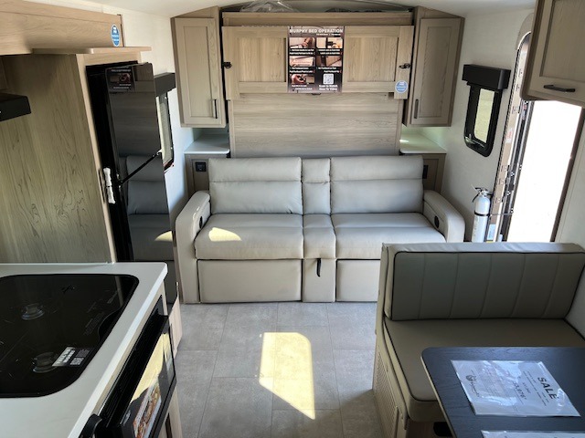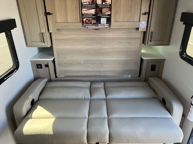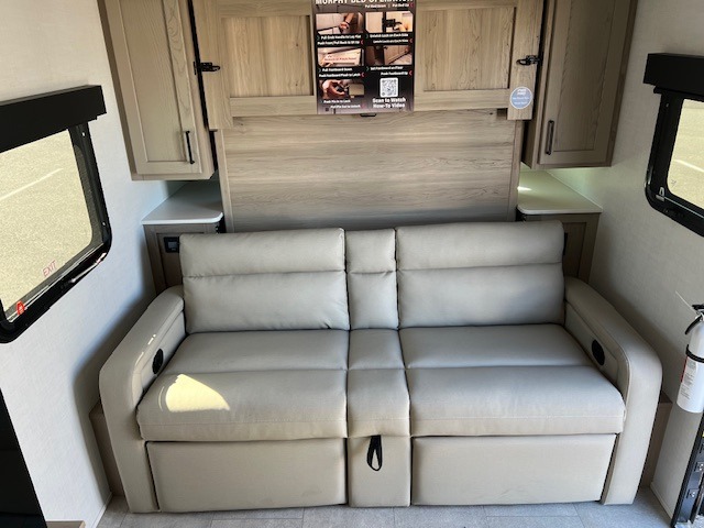 Comfortable sleeping space, convenient seating space, and a full rear bath makes this couple's trailer the one! You will love being able to relax on the sofa during the day, and sleep on the Murphy bed at night. There is a single slide out that will provide you more space to move around or cook meals, and the full bath includes a large shower so you won't feel cramped. If it's a rainy day you can watch movies on the 32" 12V TV, and if it's nice out, sit under the 14' power awning. The possibilities are endless with this couple's trailer! The optional Power Package available on this model gives you the option to go off-grid for even longer amounts of time!