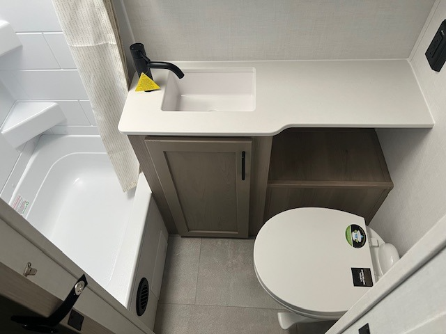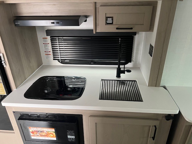 Start having unforgettable adventures with this amazing travel trailer! The queen-sized bed is the perfect spot to unwind and recharge after a day of exploring, offering a restful sleeping space that's sure to leave you feeling refreshed. The full bathroom has everything you need to refresh and rejuvenate in private. In the kitchen-living room combined area, you will find a three-burner cooktop for gourmet meals, a convection microwave for quick and easy cooking, and a spacious fridge to keep your ingredients fresh, plus overhead cabinets and a pantry/closet provide ample storage for cookware, dishes, and food. In addition, you can have endless evenings of amusement in the theater seat, which is the perfect spot to relax and enjoy your favorite shows or movies on the TV. On the outside, the exterior awning provides a shaded spot to enjoy the outdoors, while the pass-through storage offers plenty of room for gear, luggage, and equipment.