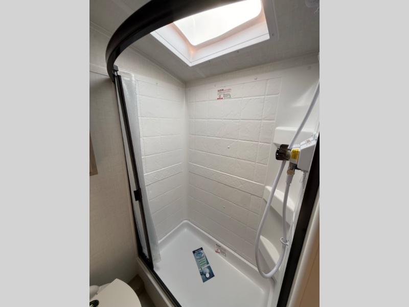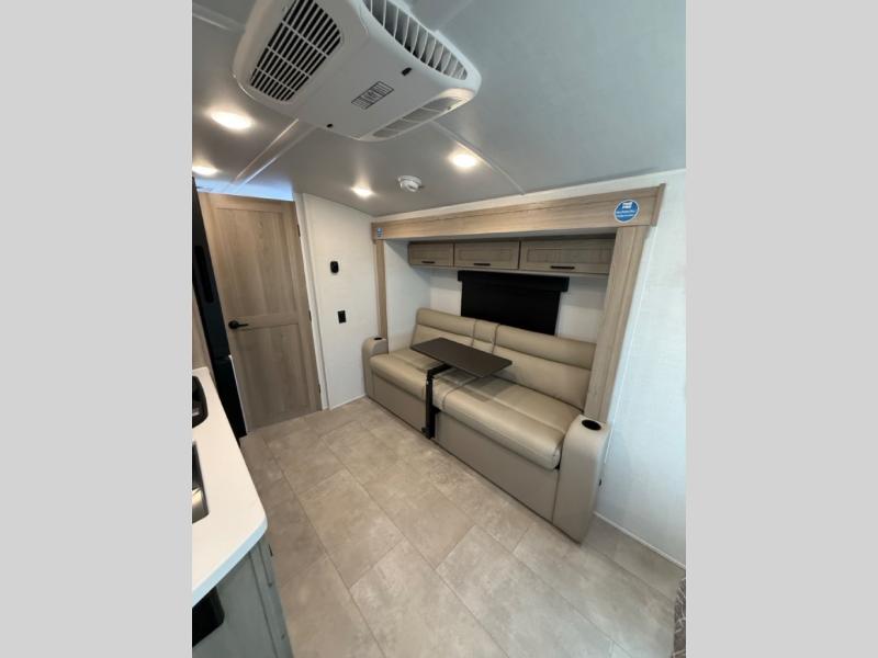This travel trailer will feel more like home with its front bedroom and walk-around full-size bed. You'll enjoy the 32" 12V TV as you relax on the 72" sofa with a table and cupholders. The full rear bath includes a spacious shower to clean up in each day and there is a linen closet for clean towels. When you're ready to prepare dinner you'll have a three burner cooktop and microwave oven indoors, and a griddle outdoors! And don't forget the exterior storage allows you to bring along beach toys and tackle boxes. The optional Power Package available on this model includes three 200W solar panels, a side solar plug-in, a 3kW 160A inverter, and more off-grid features!