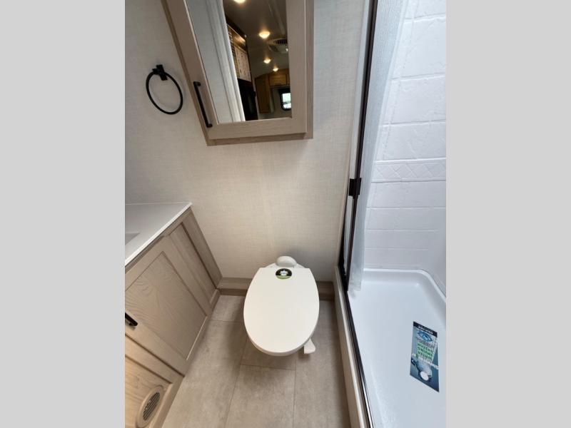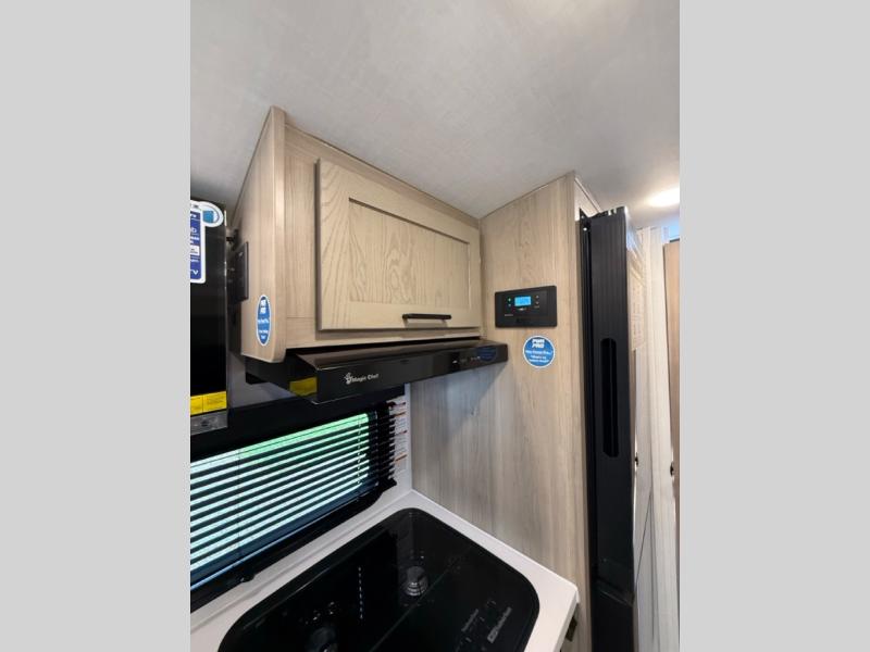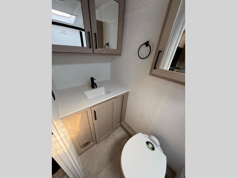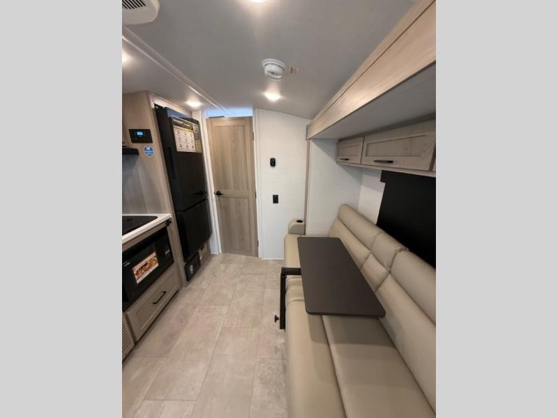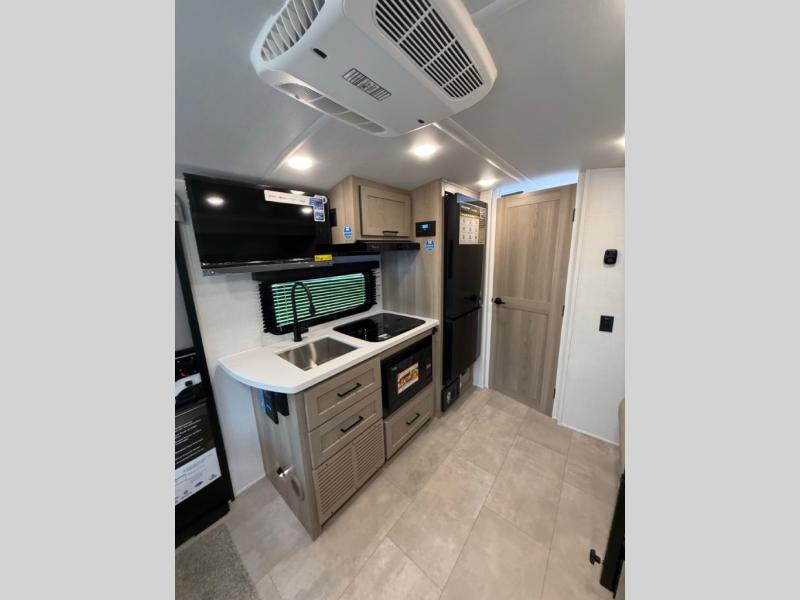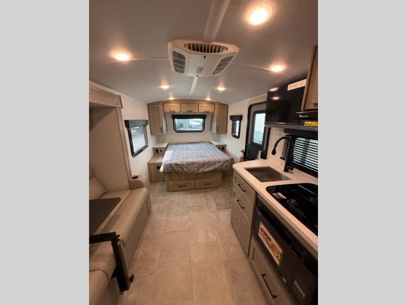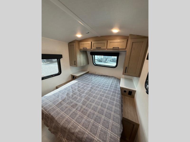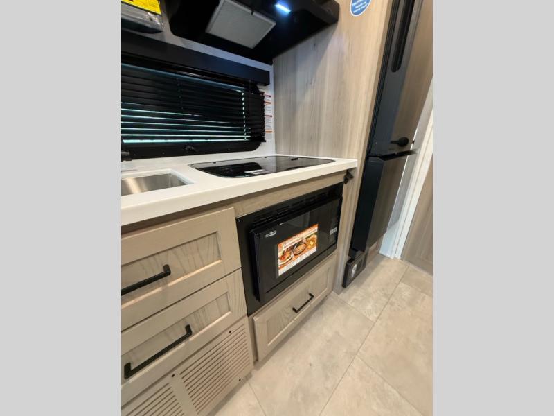 This travel trailer will feel more like home with its front bedroom and walk-around full-size bed. You'll enjoy the 32" 12V TV as you relax on the 72" sofa with a table and cupholders. The full rear bath includes a spacious shower to clean up in each day and there is a linen closet for clean towels. When you're ready to prepare dinner you'll have a three burner cooktop and microwave oven indoors, and a griddle outdoors! And don't forget the exterior storage allows you to bring along beach toys and tackle boxes. The optional Power Package available on this model includes three 200W solar panels, a side solar plug-in, a 3kW 160A inverter, and more off-grid features!