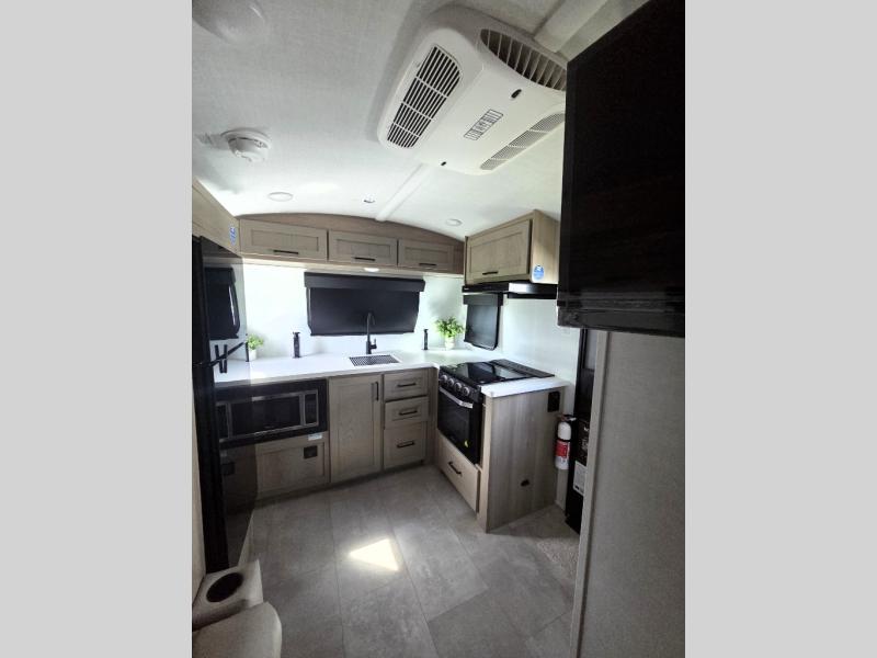 Are you looking for a lightweight trailer with at-home comforts? Take a look at this single slide out unit that can sleep three to four each night. There is a queen-size bed in the back with a 26" x 80" flip-up bunk for cozy sleeping space, a 72" sofa with cupholders to relax on, plus a 32" 12V TV for movie nights! The front kitchen includes a 12V refrigerator to store food, plus a microwave oven and a gas oven to cook meals each day.