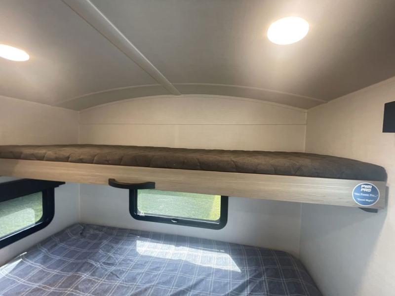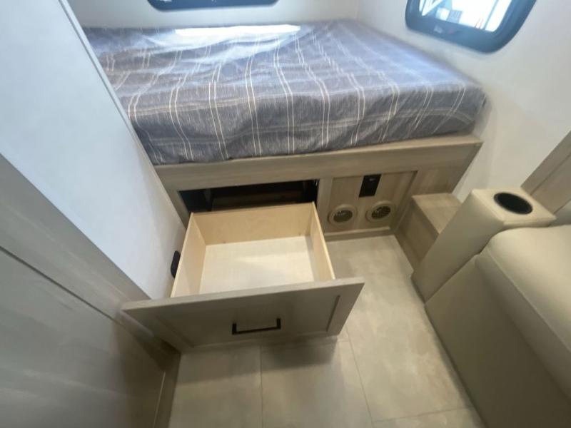 Are you looking for a lightweight trailer with at-home comforts? Take a look at this single slide out unit that can sleep three to four each night. There is a queen-size bed in the back with a 26" x 80" flip-up bunk for cozy sleeping space, a 72" sofa with cupholders to relax on, plus a 32" 12V TV for movie nights! The front kitchen includes a 12V refrigerator to store food, plus a microwave oven and a gas oven to cook meals each day.