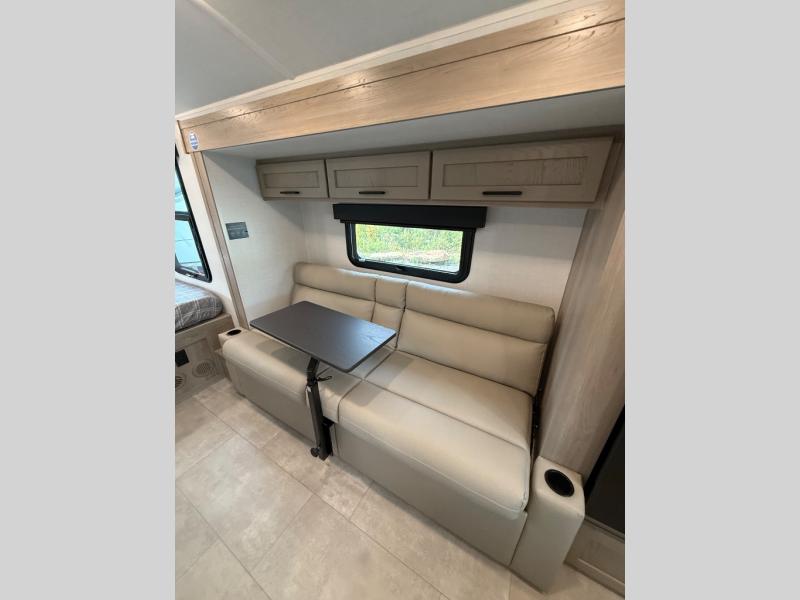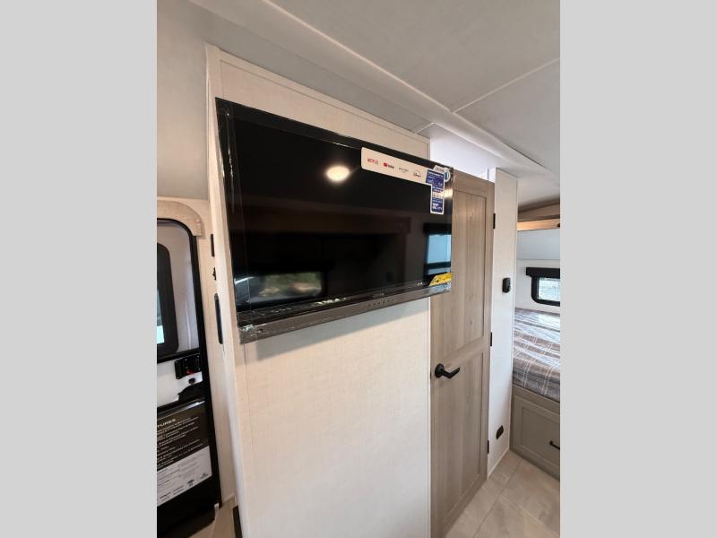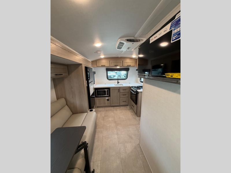 Are you looking for a lightweight trailer with at-home comforts? Take a look at this single slide out unit that can sleep three to four each night. There is a queen-size bed in the back with a 26" x 80" flip-up bunk for cozy sleeping space, a 72" sofa with cupholders to relax on, plus a 32" 12V TV for movie nights! The front kitchen includes a 12V refrigerator to store food, plus a microwave oven and a gas oven to cook meals each day.