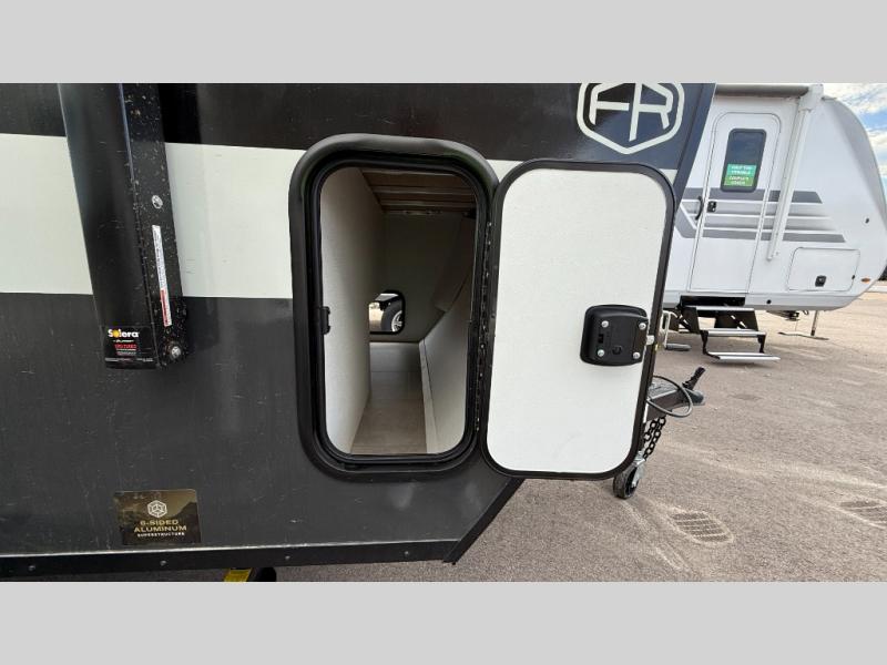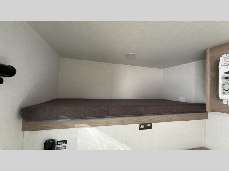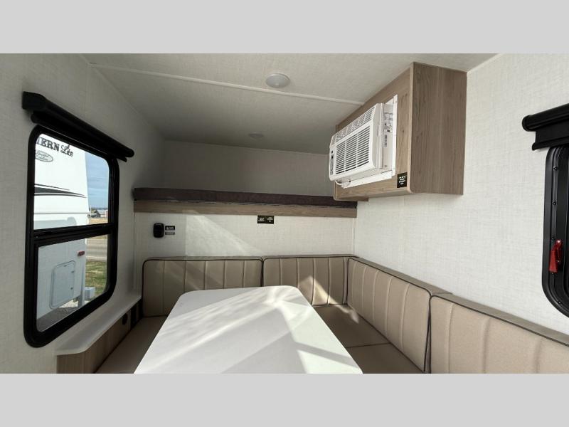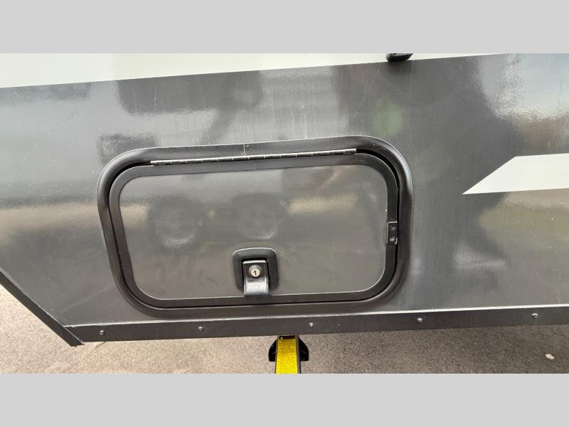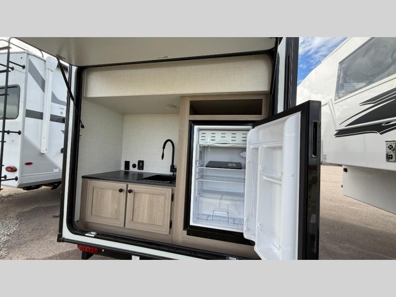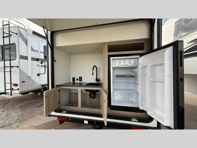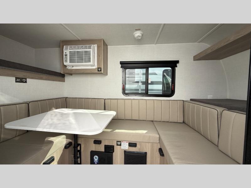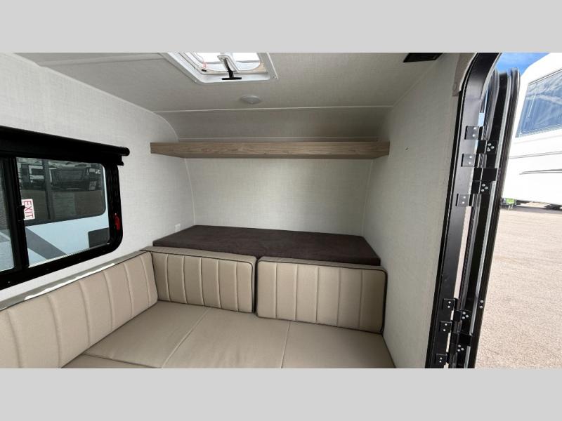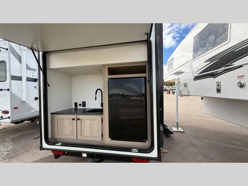 This trailer offers a comfortable and functional space to relax, recharge, and explore. The roomy U-dinette is perfect for relaxing after a long day of hiking or exploring, and adventuring, and it easily converts to a comfortable full-sized bed. Two bunks offer extra sleep areas or storage space. The outdoor kitchen is equipped with a sink, refrigerator, and plenty of storage for your gear, cookware, and essentials. Outside griddle prep gives you a perfect place for cooking delicious meals.