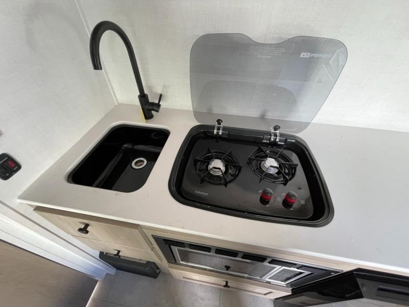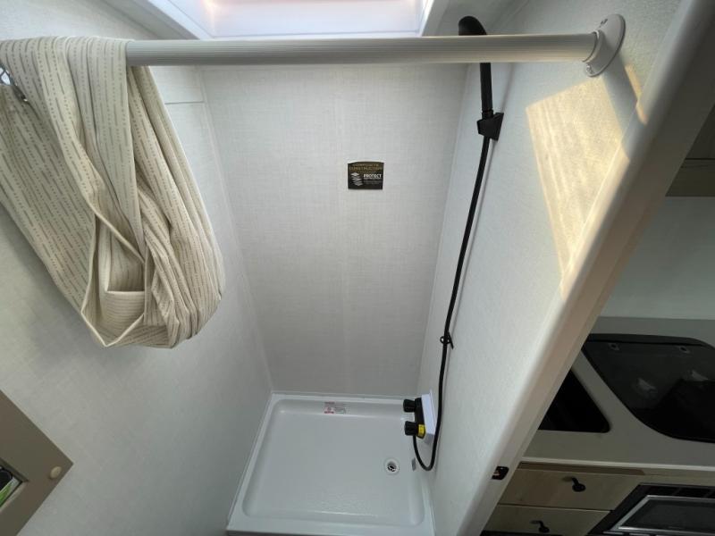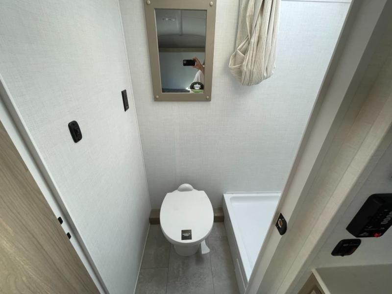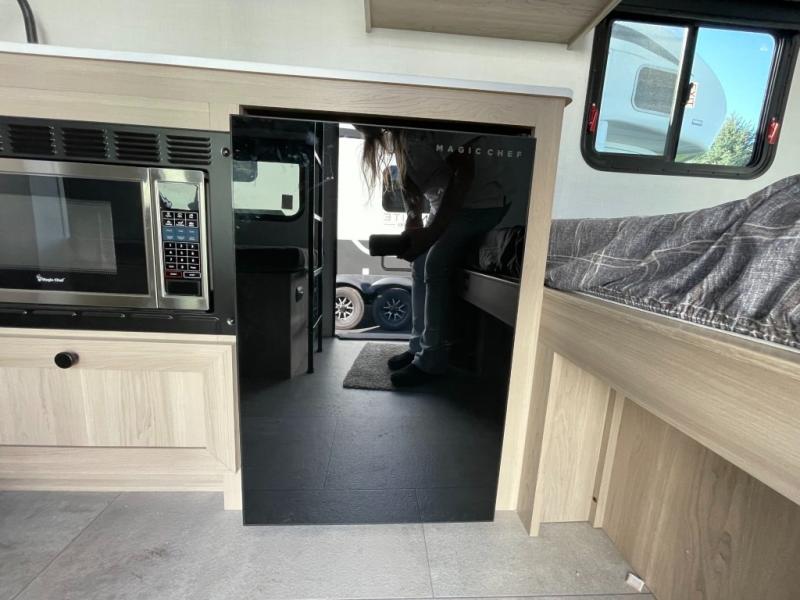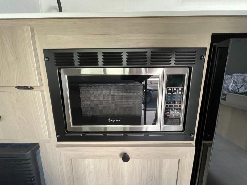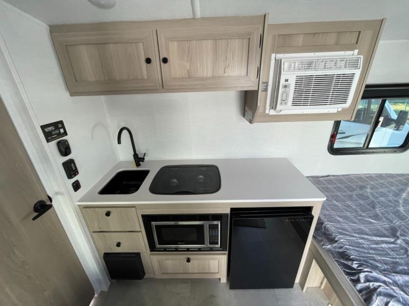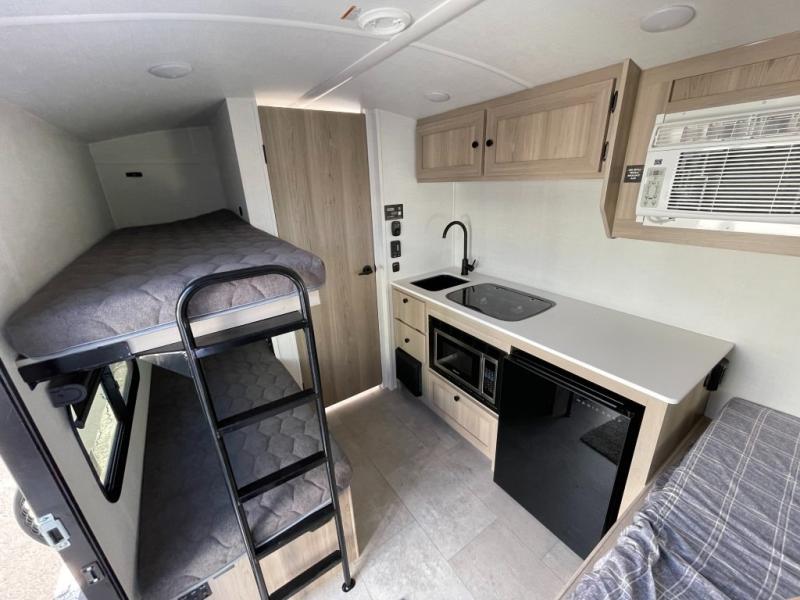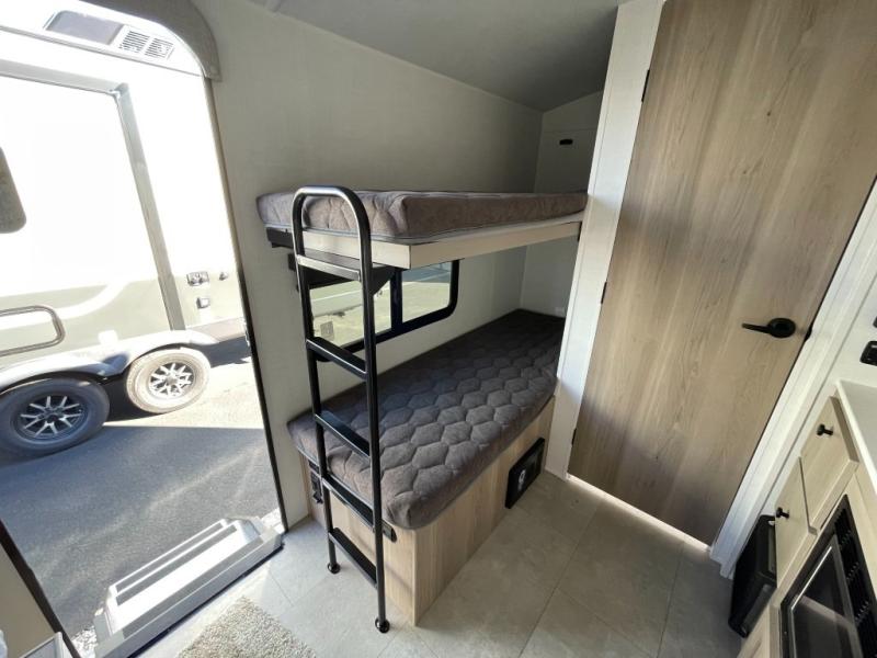 Perfect for couples, families, or friends, this trailer offers a comfortable and functional space to relax, recharge, and explore. The full bathroom is a serene retreat, equipped with everything you need to refresh and rejuvenate after a day of adventure. The two bunk beds give a snug and inviting sleeping spot, perfect for kids or adults looking for a cozy spot to rest. The kitchen is equipped with a microwave for quick and easy meal prep, and a fridge to keep your favorite snacks and drinks fresh. Overhead cabinets provide plenty of storage for your gear, cookware, and essentials, keeping your trailer tidy and organized. The bed offers a restful sleeping space, perfect for unwinding after a long day of exploring.