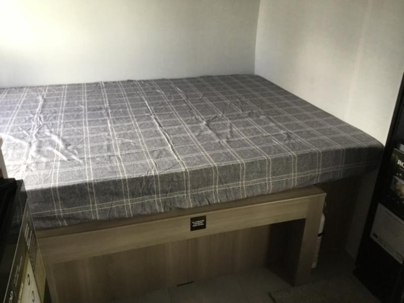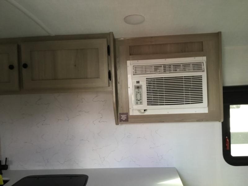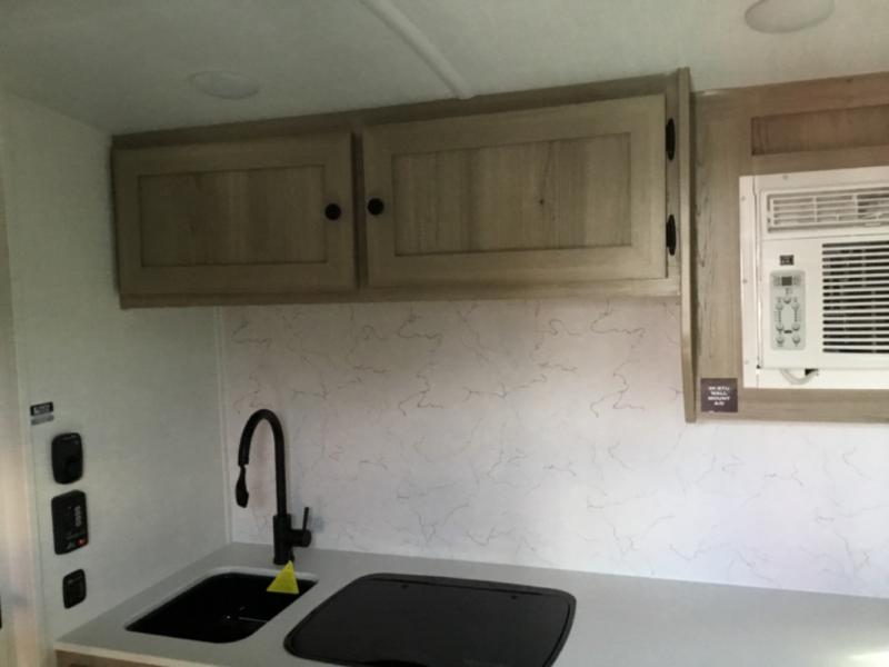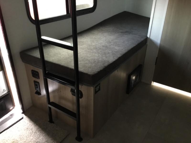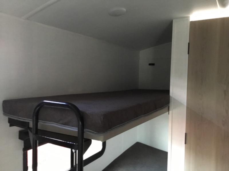 Perfect for couples, families, or friends, this trailer offers a comfortable and functional space to relax, recharge, and explore. The full bathroom is a serene retreat, equipped with everything you need to refresh and rejuvenate after a day of adventure. The two bunk beds give a snug and inviting sleeping spot, perfect for kids or adults looking for a cozy spot to rest. The kitchen is equipped with a microwave for quick and easy meal prep, and a refrigerator to keep your favorite snacks and drinks fresh. Overhead cabinets provide plenty of storage for your gear, cookware, and essentials, keeping your trailer tidy and organized. The bed offers a restful sleeping space, perfect for unwinding after a long day of exploring.