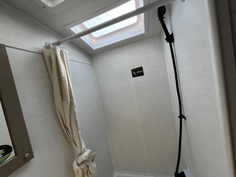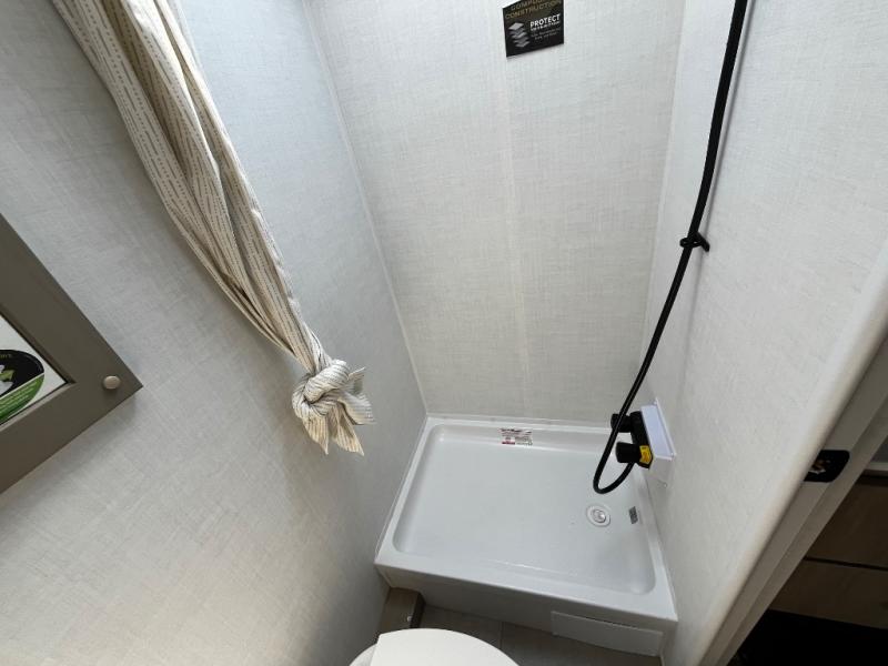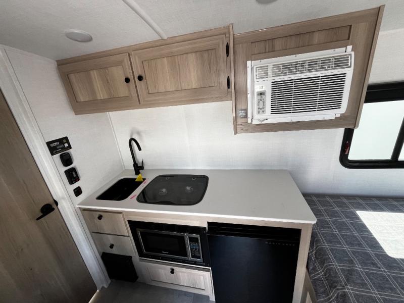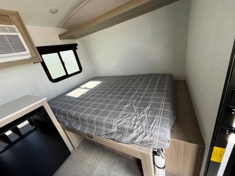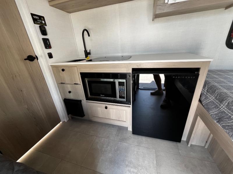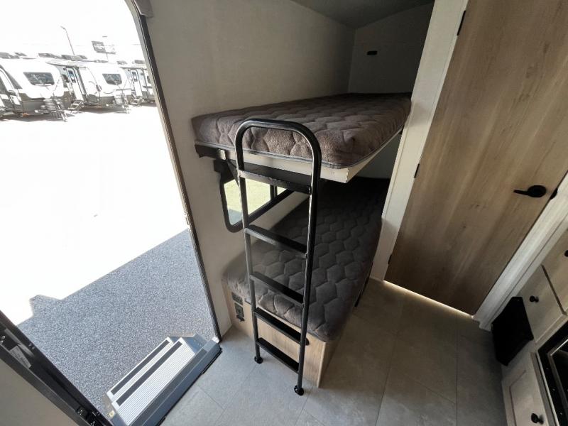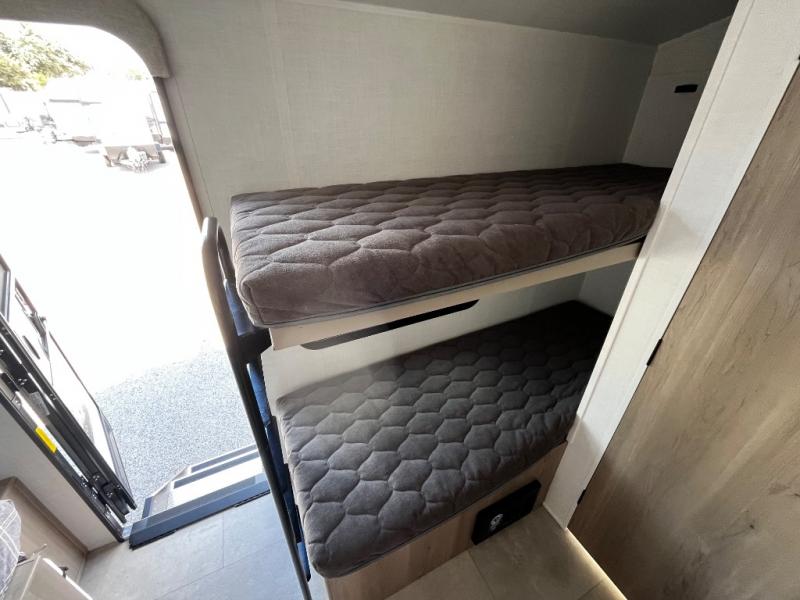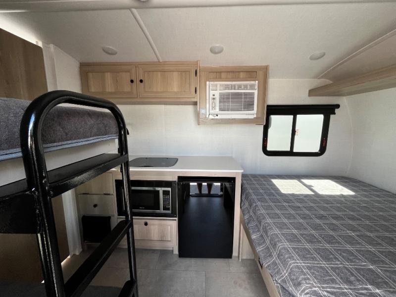 Perfect for couples, families, or friends, this trailer offers a comfortable and functional space to relax, recharge, and explore. The full bathroom is a serene retreat, equipped with everything you need to refresh and rejuvenate after a day of adventure. The two bunk beds give a snug and inviting sleeping spot, perfect for kids or adults looking for a cozy spot to rest. The kitchen is equipped with a microwave for quick and easy meal prep, and a fridge to keep your favorite snacks and drinks fresh. Overhead cabinets provide plenty of storage for your gear, cookware, and essentials, keeping your trailer tidy and organized. The bed offers a restful sleeping space, perfect for unwinding after a long day of exploring.