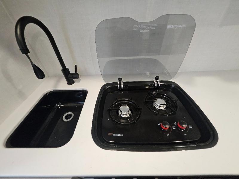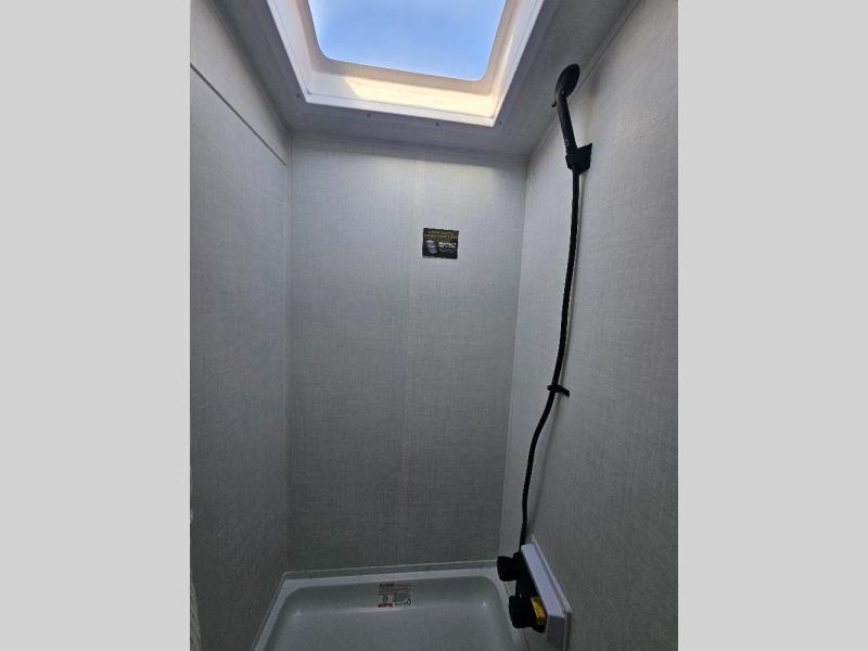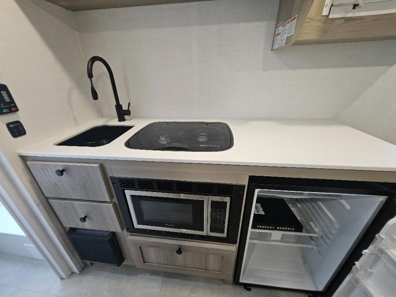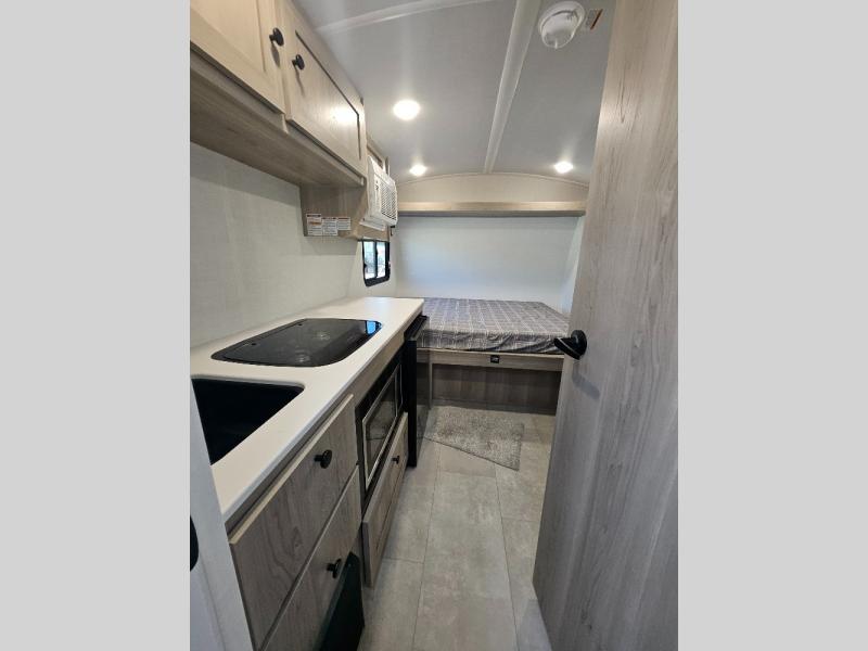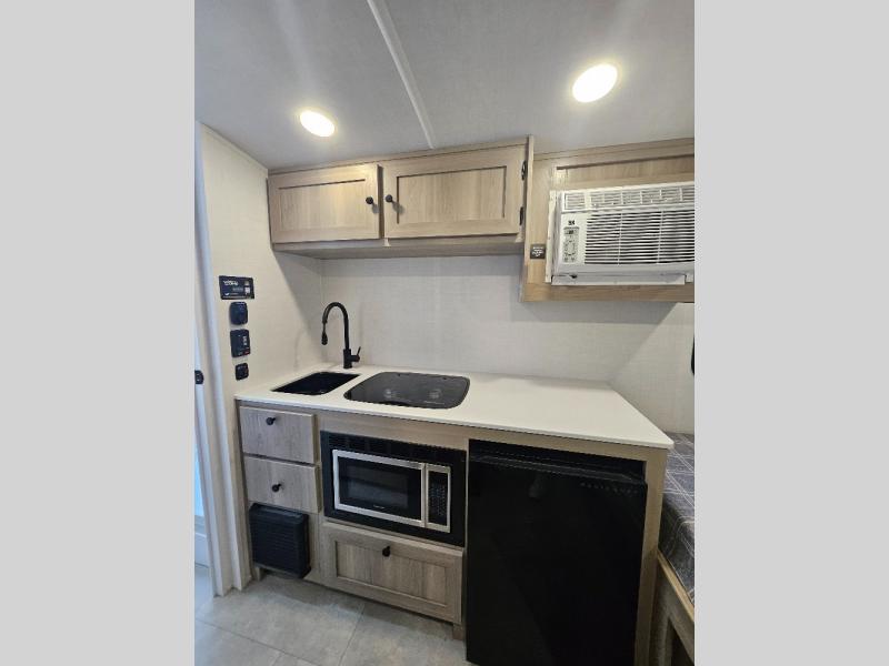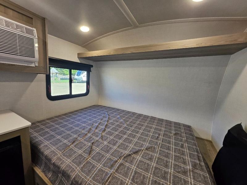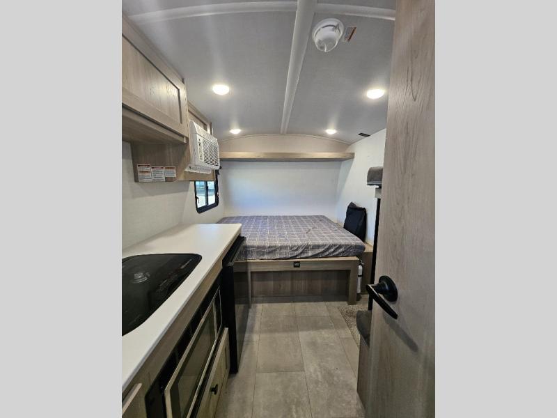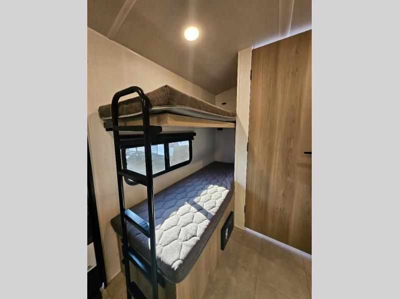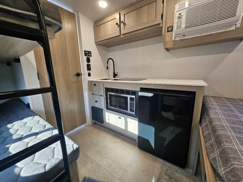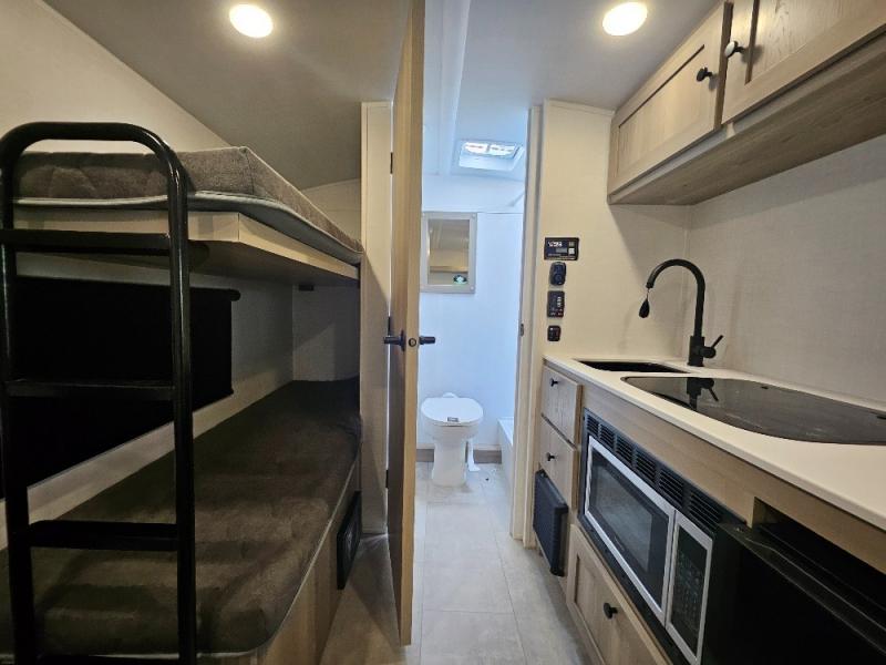 Perfect for couples, families, or friends, this trailer offers a comfortable and functional space to relax, recharge, and explore. The full bathroom is a serene retreat, equipped with everything you need to refresh and rejuvenate after a day of adventure. The two bunk beds give a snug and inviting sleeping spot, perfect for kids or adults looking for a cozy spot to rest. The kitchen is equipped with a microwave for quick and easy meal prep, and a fridge to keep your favorite snacks and drinks fresh. Overhead cabinets provide plenty of storage for your gear, cookware, and essentials, keeping your trailer tidy and organized. The bed offers a restful sleeping space, perfect for unwinding after a long day of exploring.