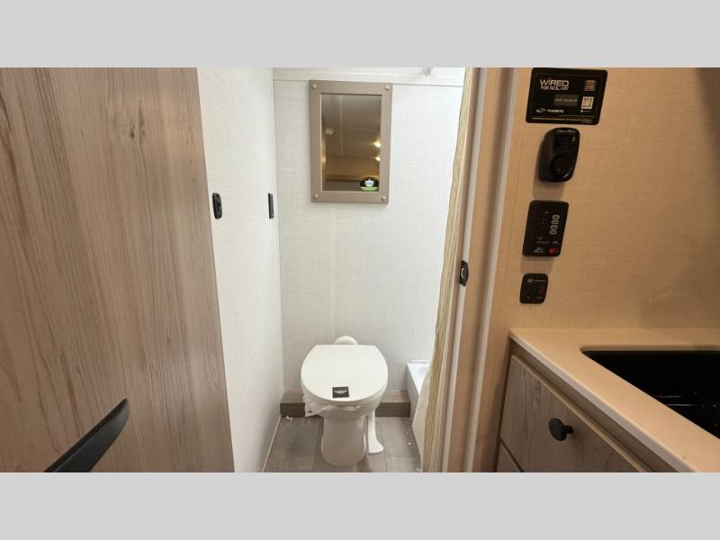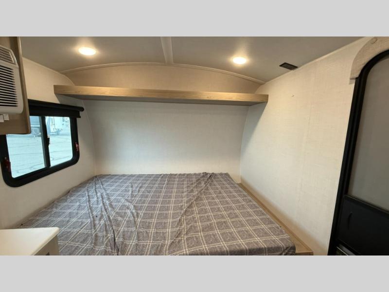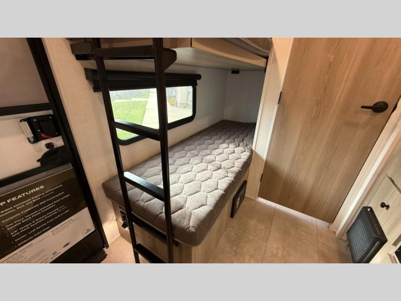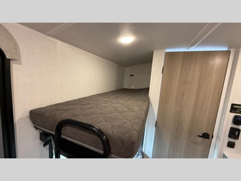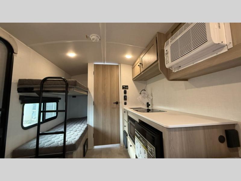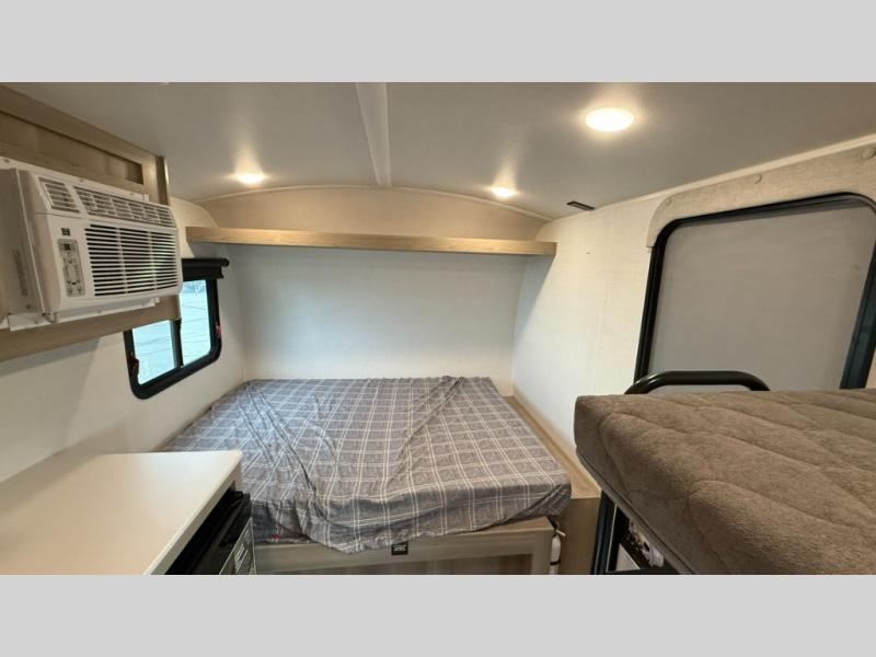 Perfect for couples, families, or friends, this trailer offers a comfortable and functional space to relax, recharge, and explore. The full bathroom is a serene retreat, equipped with everything you need to refresh and rejuvenate after a day of adventure. The two bunk beds give a snug and inviting sleeping spot, perfect for kids or adults looking for a cozy spot to rest. The kitchen is equipped with a microwave for quick and easy meal prep, and a fridge to keep your favorite snacks and drinks fresh. Overhead cabinets provide plenty of storage for your gear, cookware, and essentials, keeping your trailer tidy and organized. The bed offers a restful sleeping space, perfect for unwinding after a long day of exploring.