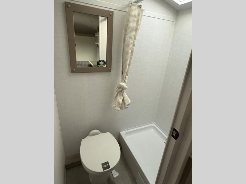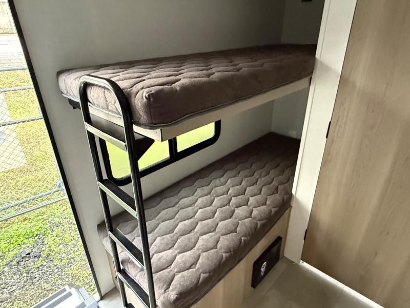 Perfect for couples, families, or friends, this trailer offers a comfortable and functional space to relax, recharge, and explore. The full bathroom is a serene retreat, equipped with everything you need to refresh and rejuvenate after a day of adventure. The two bunk beds give a snug and inviting sleeping spot, perfect for kids or adults looking for a cozy spot to rest. The kitchen is equipped with a microwave for quick and easy meal prep, and a refrigerator to keep your favorite snacks and drinks fresh. Overhead cabinets provide plenty of storage for your gear, cookware, and essentials, keeping your trailer tidy and organized. The bed offers a restful sleeping space, perfect for unwinding after a long day of exploring.