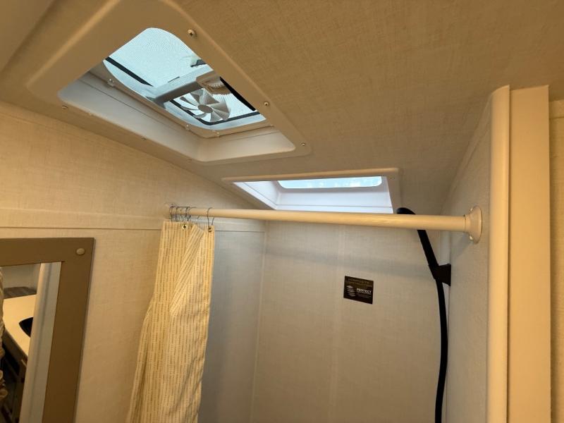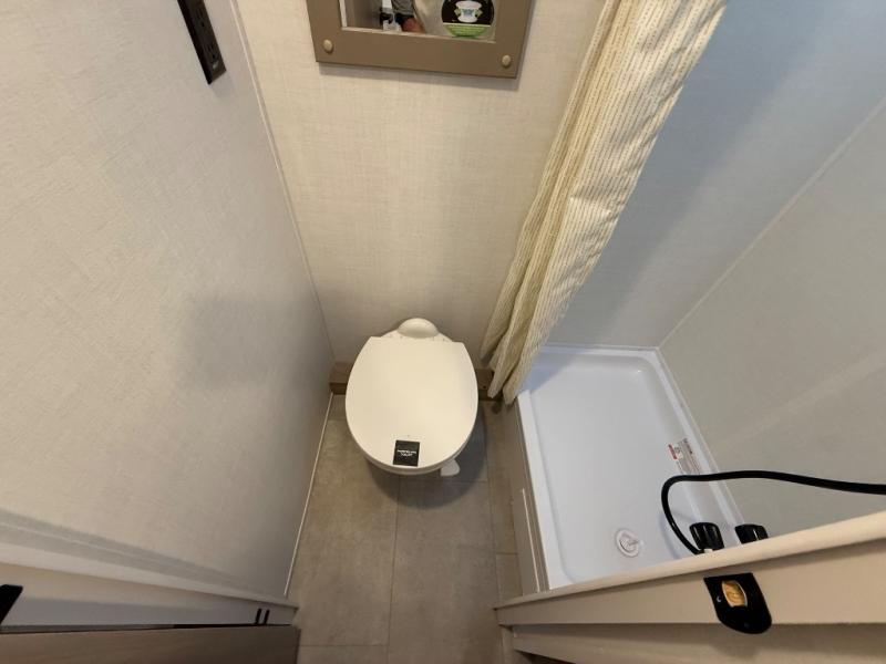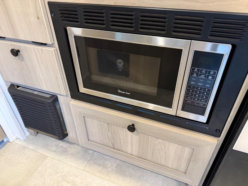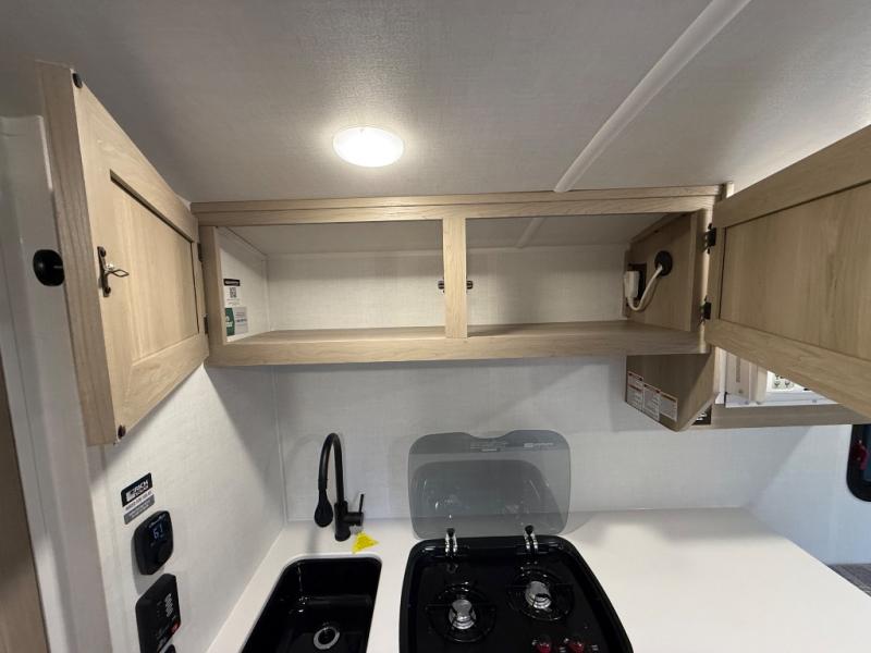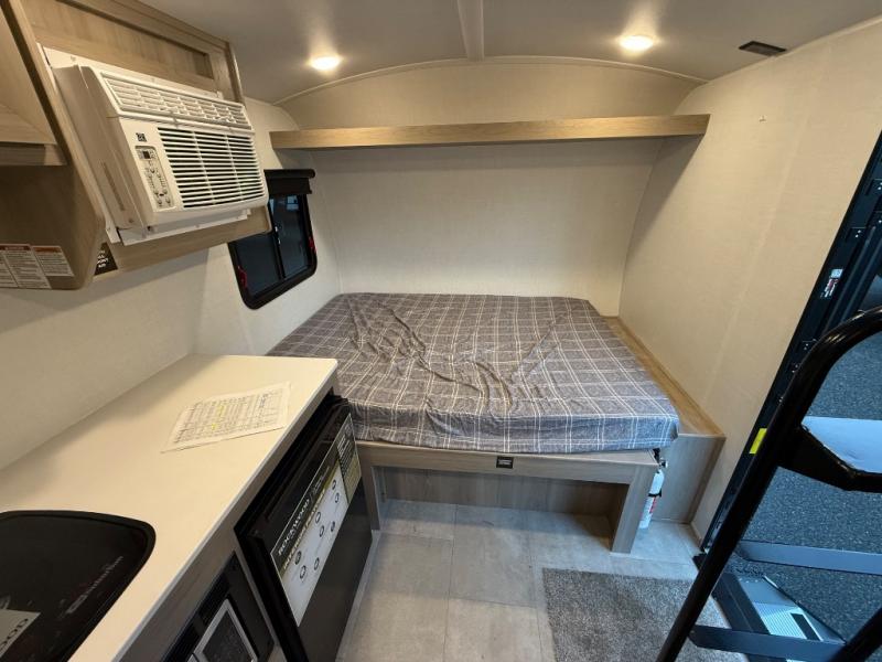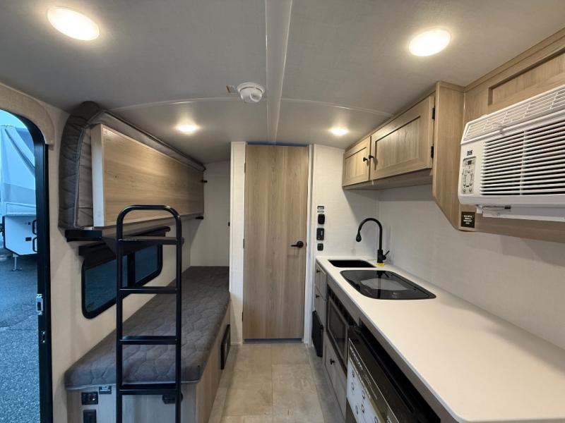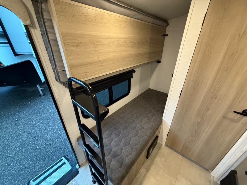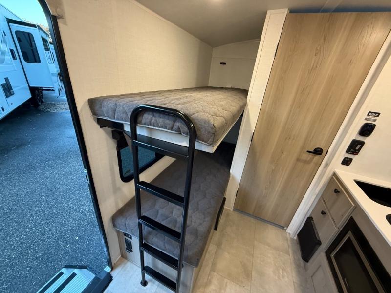 Perfect for couples, families, or friends, this trailer offers a comfortable and functional space to relax, recharge, and explore. The full bathroom is a serene retreat, equipped with everything you need to refresh and rejuvenate after a day of adventure. The two bunk beds give a snug and inviting sleeping spot, perfect for kids or adults looking for a cozy spot to rest. The kitchen is equipped with a microwave for quick and easy meal prep, and a fridge to keep your favorite snacks and drinks fresh. Overhead cabinets provide plenty of storage for your gear, cookware, and essentials, keeping your trailer tidy and organized. The bed offers a restful sleeping space, perfect for unwinding after a long day of exploring.