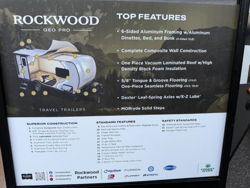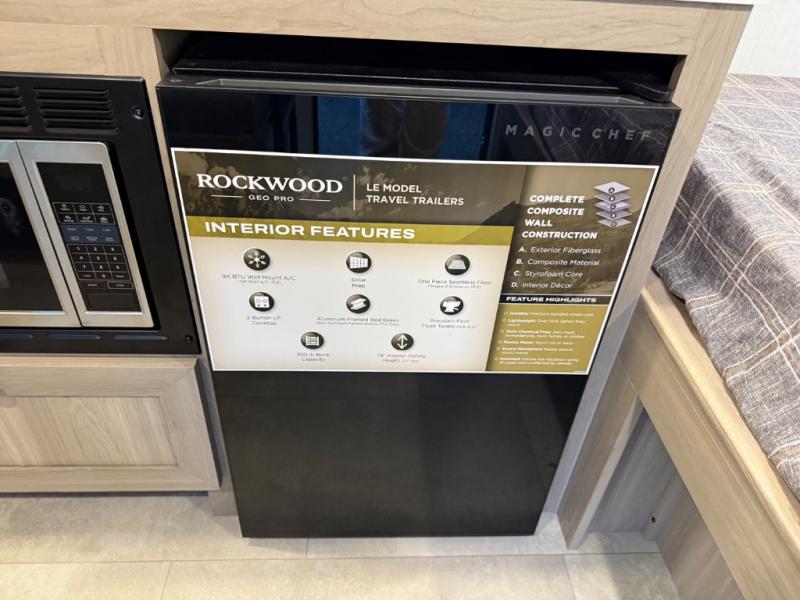 With any Rockwood GEO Pro travel trailer by Forest River you will enjoy easy towing, durable construction, and off-road capabilities with larger laminated roof! Each model is constructed with complete composite wall construction for added strength and durability, and Dexter® axles that will make towing easier than ever. Inside, you'll find sleek back up camera prep for added security, a refrigerator and a microwave, plus many other interior amenities that will make you feel at home on the road.