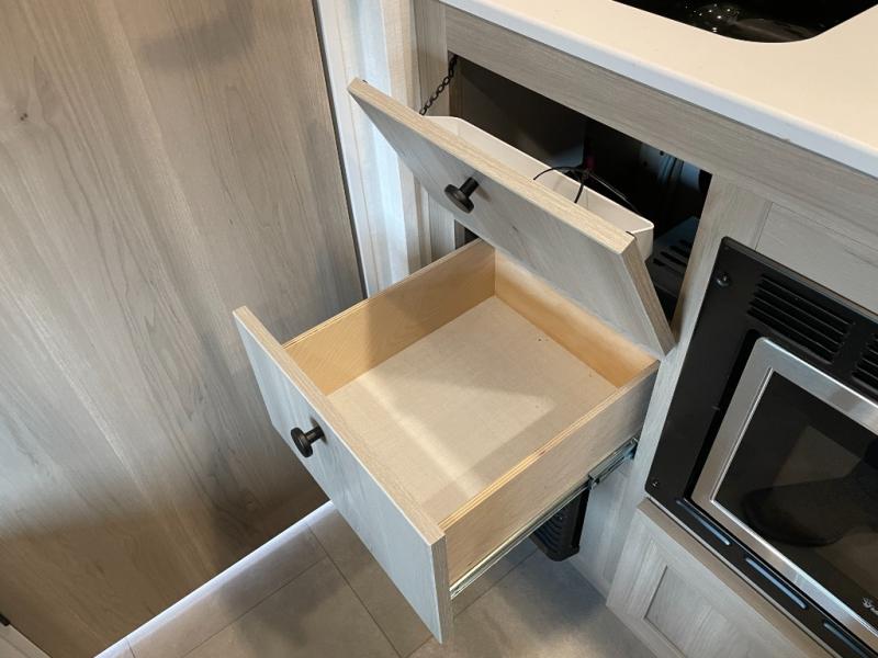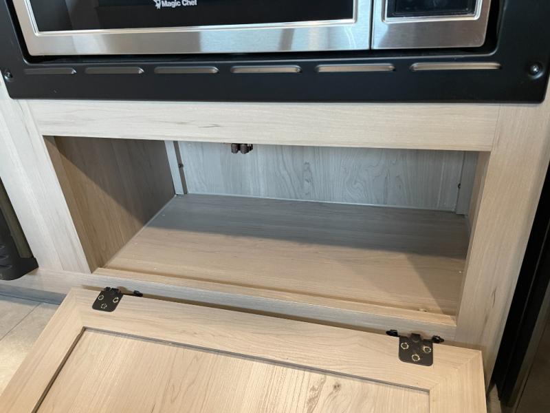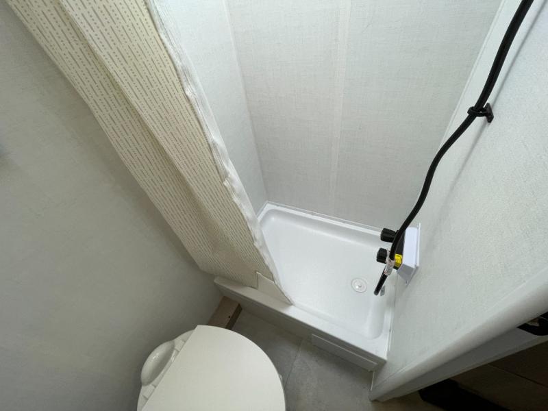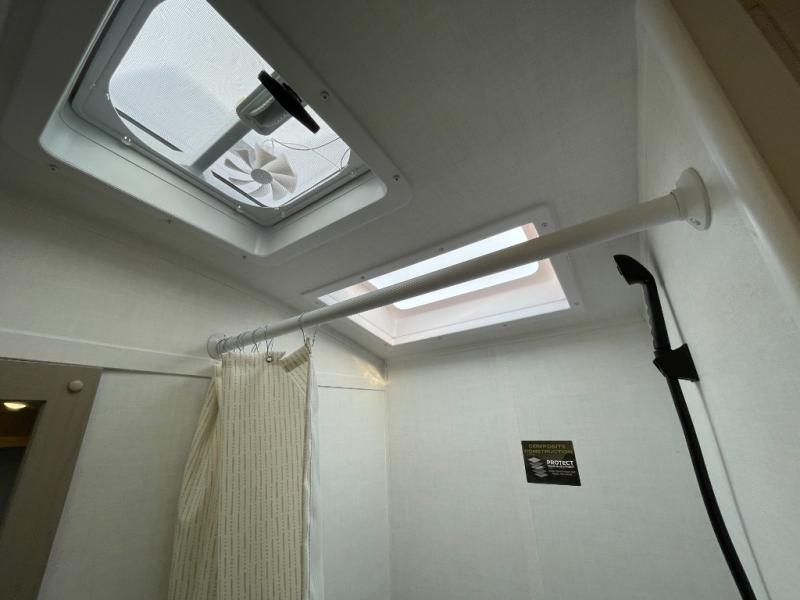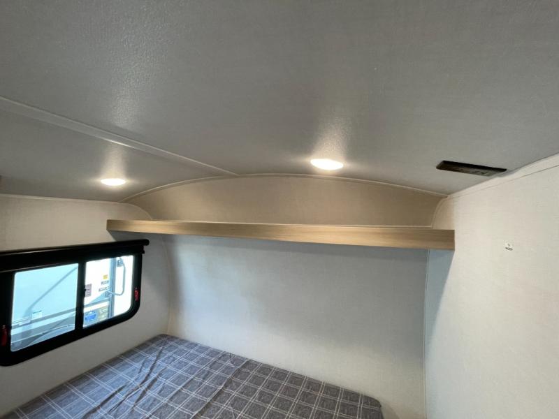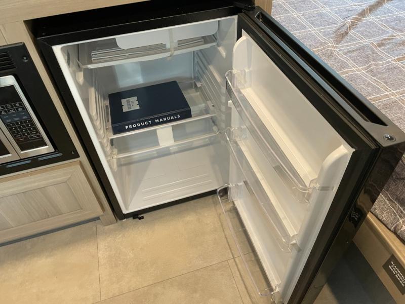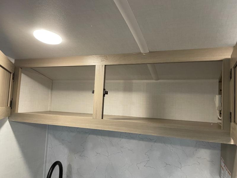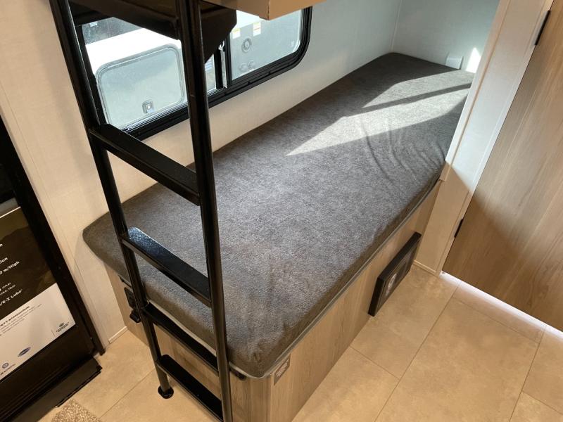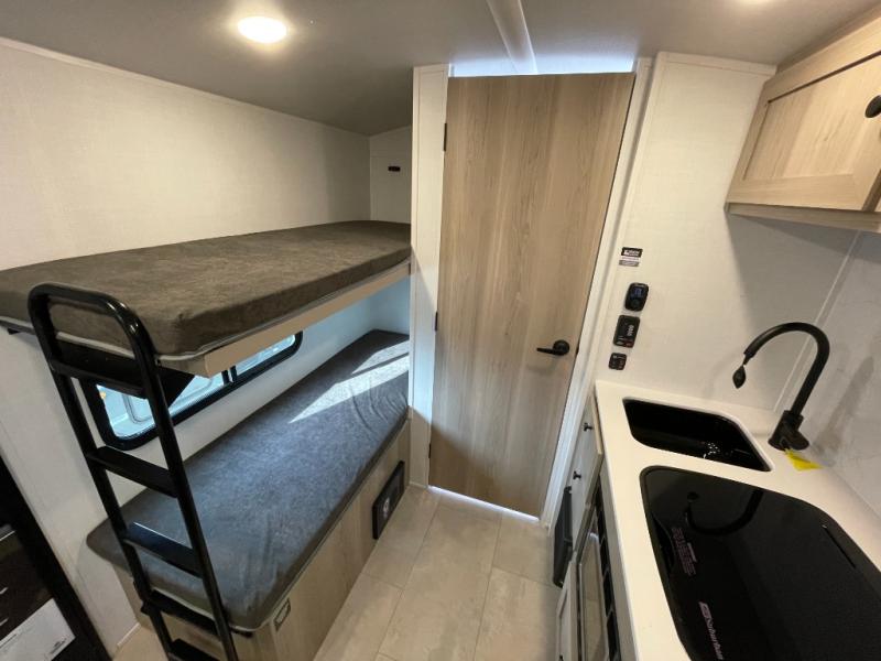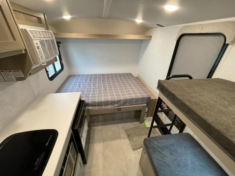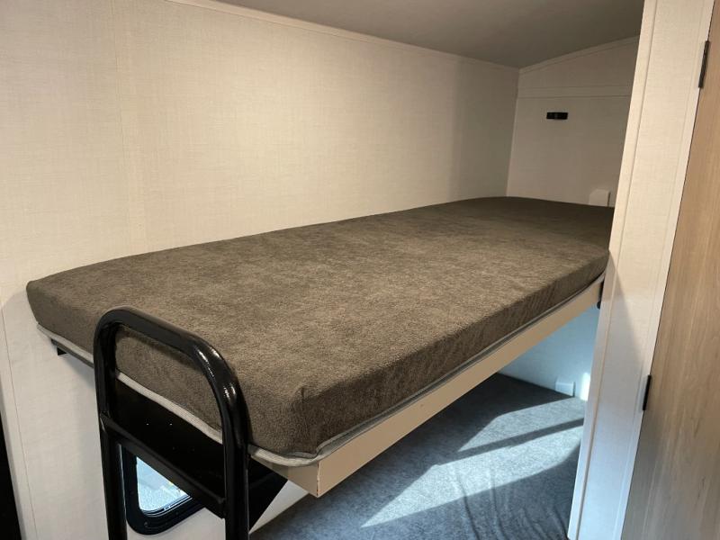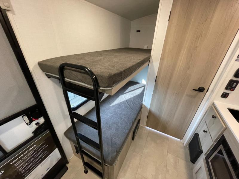 Perfect for couples, families, or friends, this trailer offers a comfortable and functional space to relax, recharge, and explore. The full bathroom is a serene retreat, equipped with everything you need to refresh and rejuvenate after a day of adventure. The two bunk beds give a snug and inviting sleeping spot, perfect for kids or adults looking for a cozy spot to rest. The kitchen is equipped with a microwave for quick and easy meal prep, and a fridge to keep your favorite snacks and drinks fresh. Overhead cabinets provide plenty of storage for your gear, cookware, and essentials, keeping your trailer tidy and organized. The bed offers a restful sleeping space, perfect for unwinding after a long day of exploring.