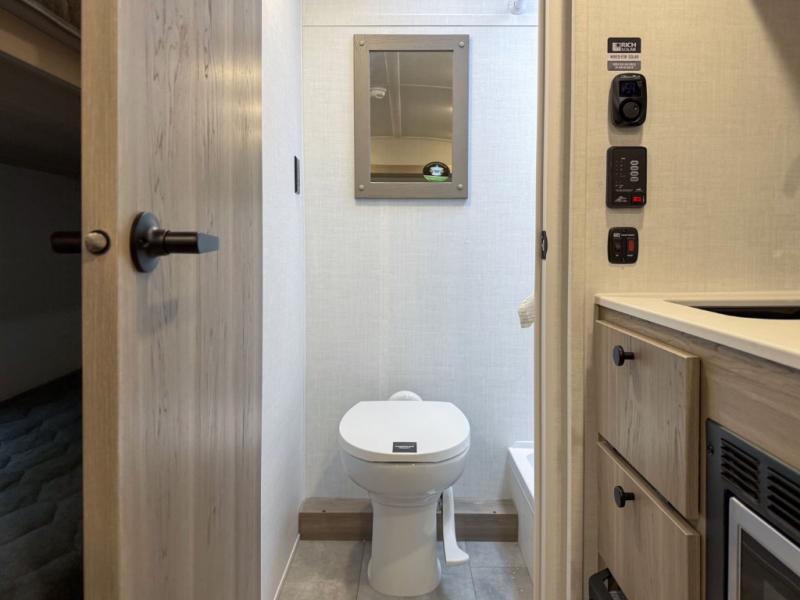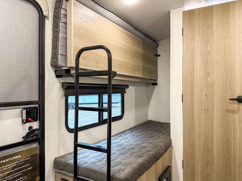 Perfect for couples, families, or friends, this trailer offers a comfortable and functional space to relax, recharge, and explore. The full bathroom is a serene retreat, equipped with everything you need to refresh and rejuvenate after a day of adventure. The two bunk beds give a snug and inviting sleeping spot, perfect for kids or adults looking for a cozy spot to rest. The kitchen is equipped with a microwave for quick and easy meal prep, and a fridge to keep your favorite snacks and drinks fresh. Overhead cabinets provide plenty of storage for your gear, cookware, and essentials, keeping your trailer tidy and organized. The bed offers a restful sleeping space, perfect for unwinding after a long day of exploring.
