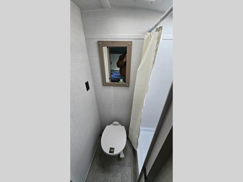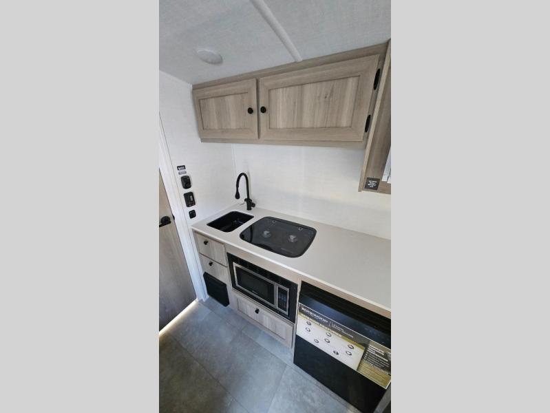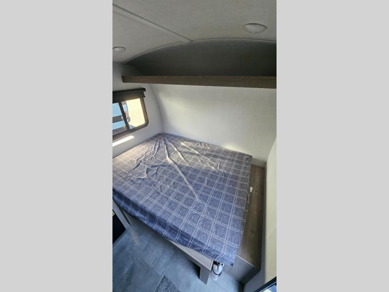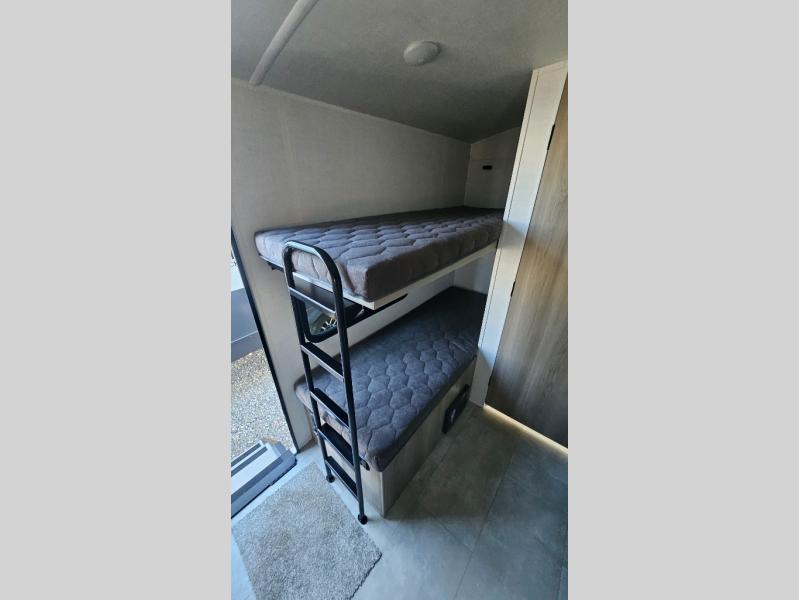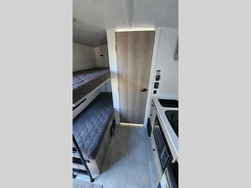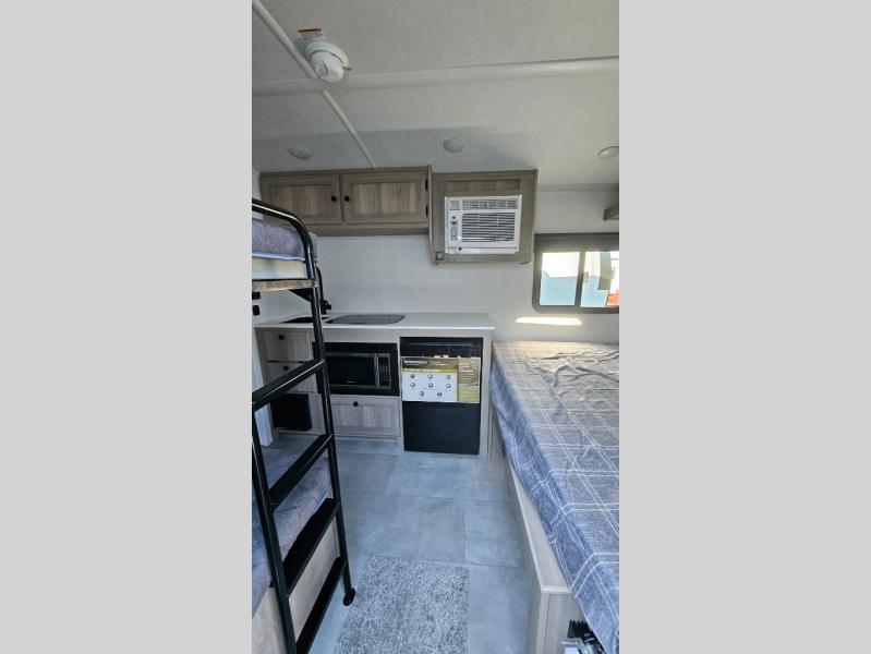Perfect for couples, families, or friends, this trailer offers a comfortable and functional space to relax, recharge, and explore. The full bathroom is a serene retreat, equipped with everything you need to refresh and rejuvenate after a day of adventure. The two bunk beds give a snug and inviting sleeping spot, perfect for kids or adults looking for a cozy spot to rest. The kitchen is equipped with a microwave for quick and easy meal prep, and a refrigerator to keep your favorite snacks and drinks fresh. Overhead cabinets provide plenty of storage for your gear, cookware, and essentials, keeping your trailer tidy and organized. The bed offers a restful sleeping space, perfect for unwinding after a long day of exploring.