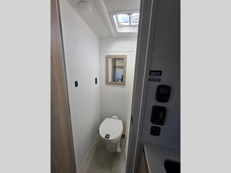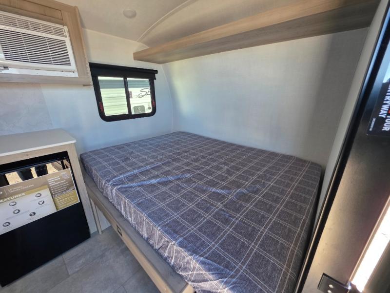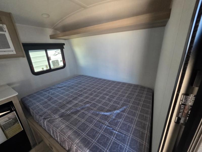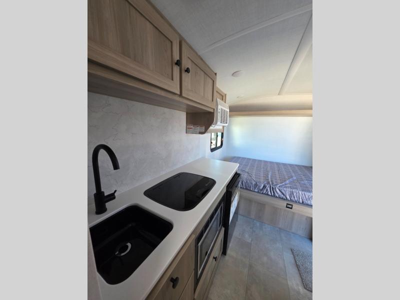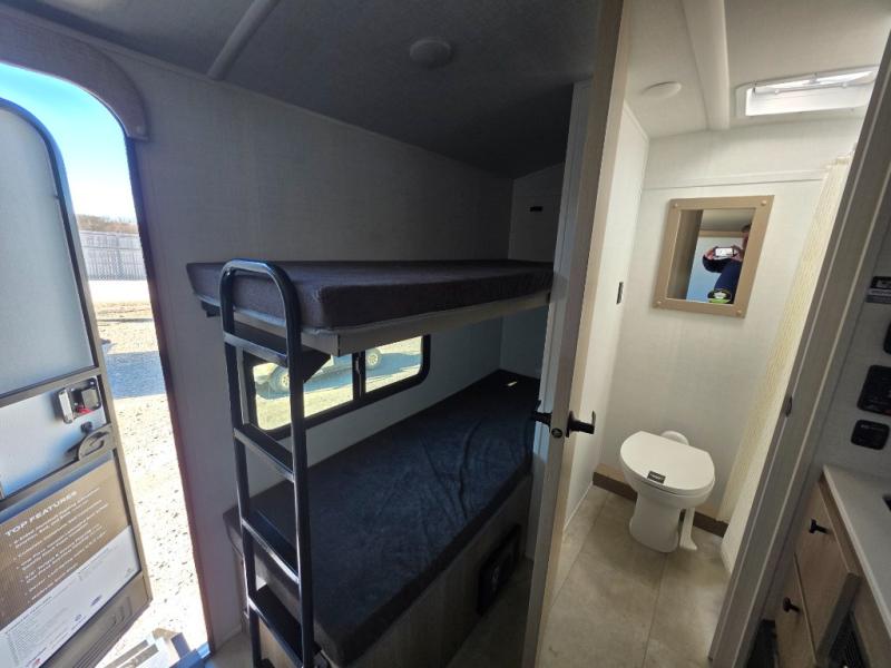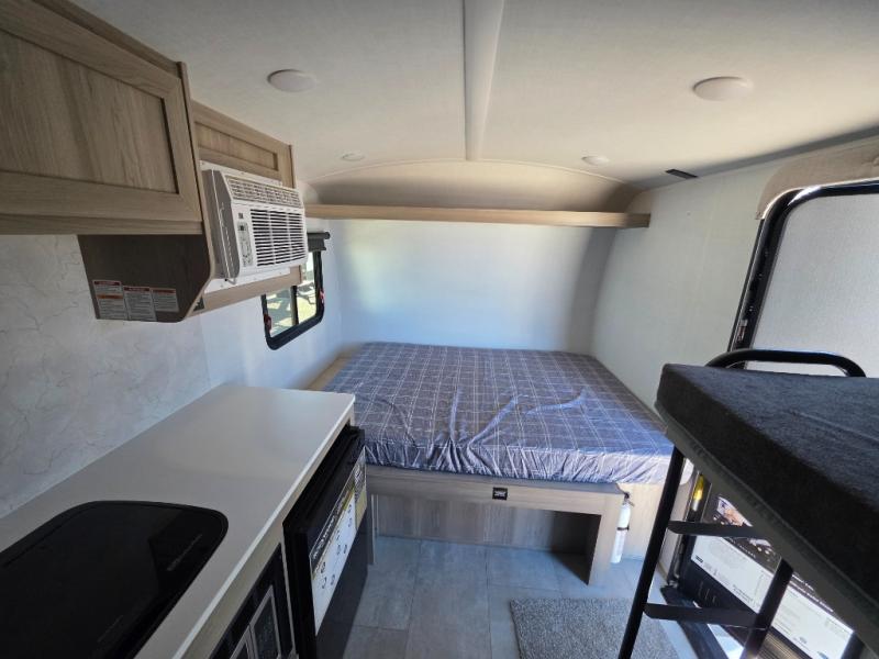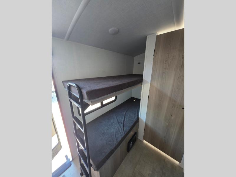 Perfect for couples, families, or friends, this trailer offers a comfortable and functional space to relax, recharge, and explore. The full bathroom is a serene retreat, equipped with everything you need to refresh and rejuvenate after a day of adventure. The two bunk beds give a snug and inviting sleeping spot, perfect for kids or adults looking for a cozy spot to rest. The kitchen is equipped with a microwave for quick and easy meal prep, and a refrigerator to keep your favorite snacks and drinks fresh. Overhead cabinets provide plenty of storage for your gear, cookware, and essentials, keeping your trailer tidy and organized. The bed offers a restful sleeping space, perfect for unwinding after a long day of exploring.