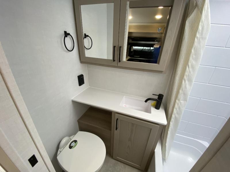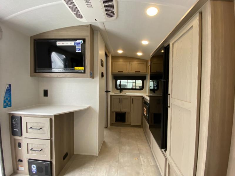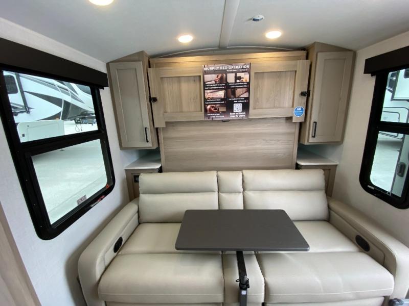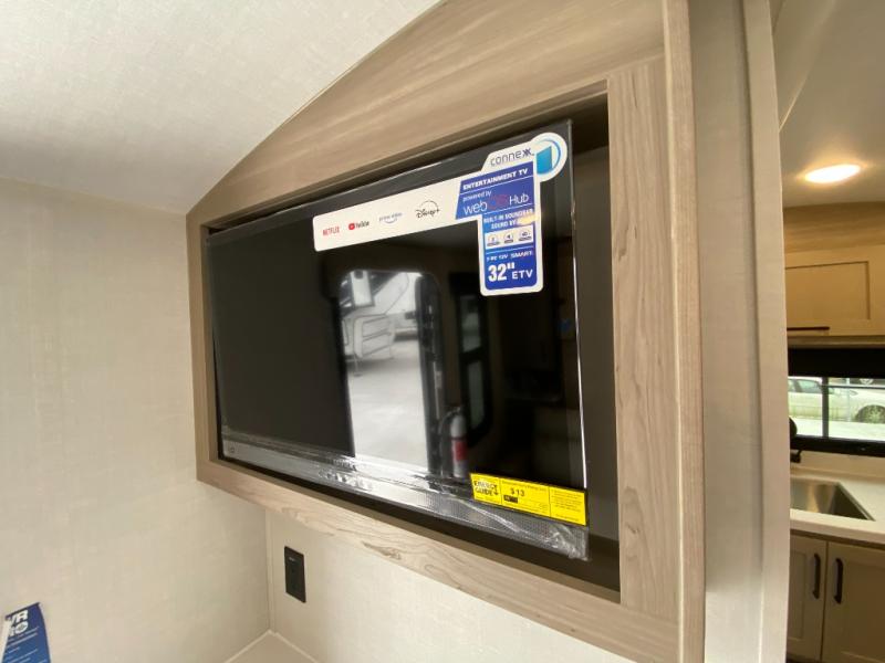 Pack your bags and head to your local state park in this travel trailer! You will love the extra space you have thanks to the kitchen slide out, and the jack knife sofa can fold away at night so you can sleep on the Murphy bed! This model includes a 32" 12V TV to keep you entertained on those rainy days, and the full bath will let you get cleaned up if you decide to hike despite the weather. There will be plenty of storage space for your belongings and gear since there is a pass-through storage and additional exterior storage, and don't overlook the exterior griddle for breakfast outdoors!