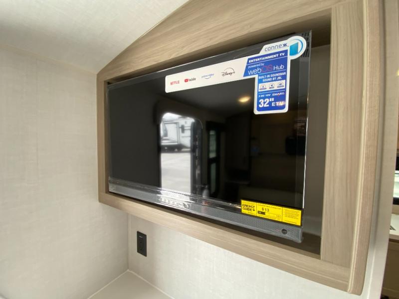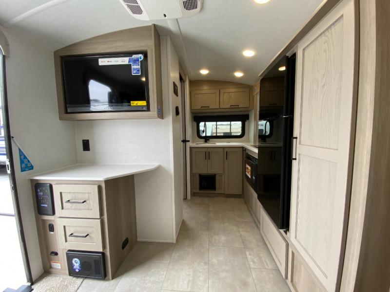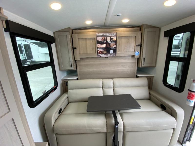 Pack your bags and head to your local state park in this travel trailer! You will love the extra space you have thanks to the kitchen slide out, and the jack knife sofa can fold away at night so you can sleep on the Murphy bed! This model includes a 32" 12V TV to keep you entertained on those rainy days, and the full bath will let you get cleaned up if you decide to hike despite the weather. There will be plenty of storage space for your belongings and gear since there is a pass-through storage and additional exterior storage, and don't overlook the exterior griddle for breakfast outdoors!