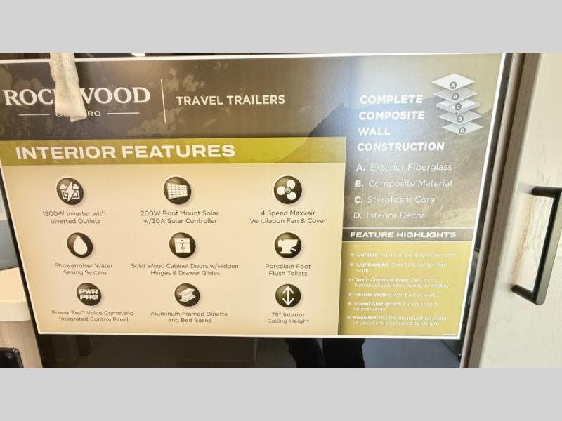With any Rockwood GEO Pro travel trailer by Forest River you will enjoy easy towing, durable construction, and off-road capabilities with larger 15" tires and a lift kit! Each model is constructed with complete composite wall construction for added strength and durability, and the torsion axle, Rubber-Ryde suspension will make towing easier than ever. Inside, you'll find sleek roller shades for added privacy, a 12V refrigerator and a microwave, plus a 20,000 BTU furnace to keep you warm during the colder camping months.