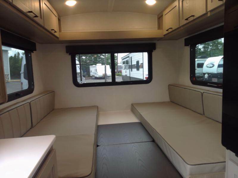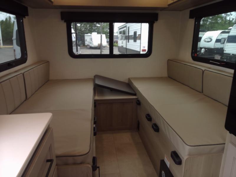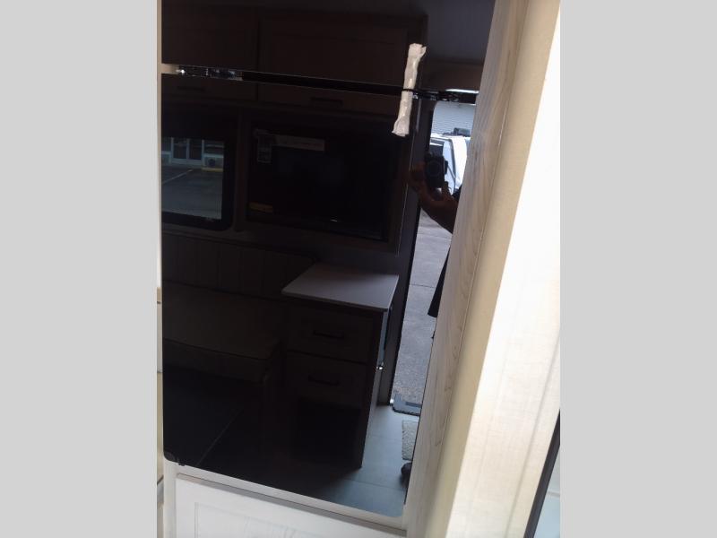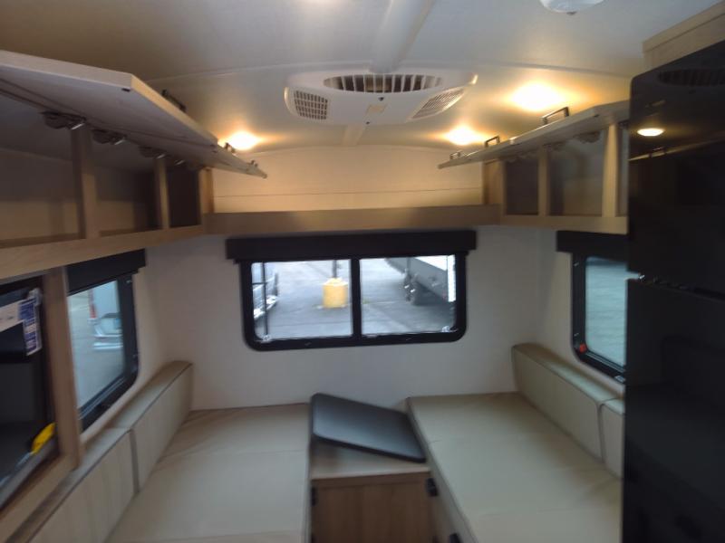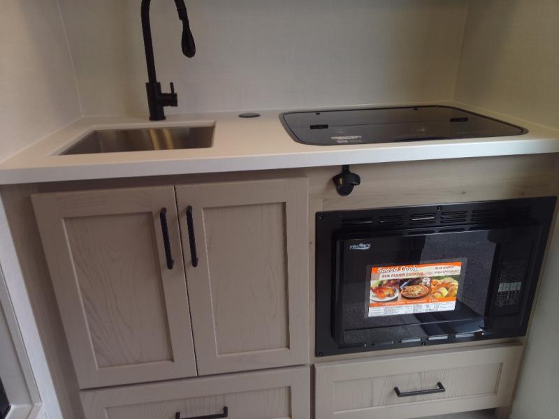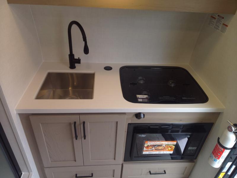 It won't be hard to find comfort in this travel trailer. It may be smaller on size, but it doesn't skim on features. The twin beds convert to a king-size bed for your comfort, and there is even a 32" 12V TV to enjoy in the evenings. The kitchen includes a three burner cooktop, a convection microwave, plus a 12V refrigerator for perishables. You'll find overhead compartments for your valuables and exterior storage for your hiking gear!