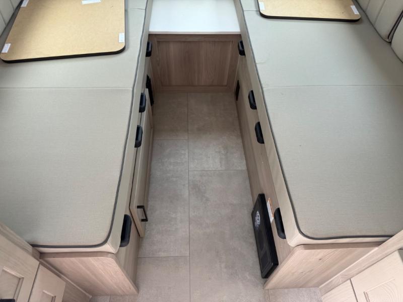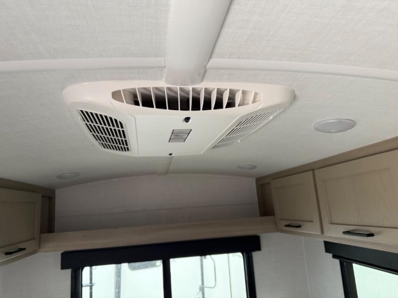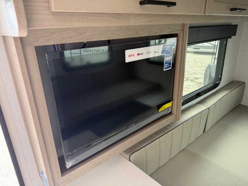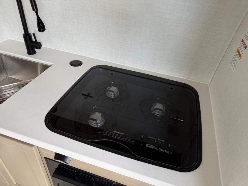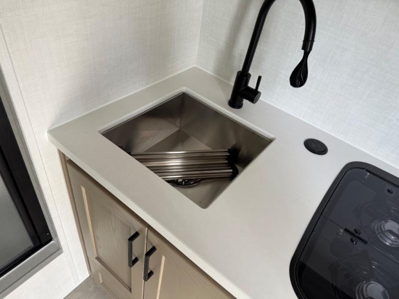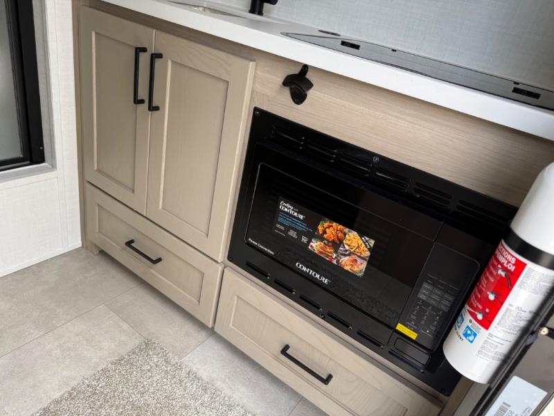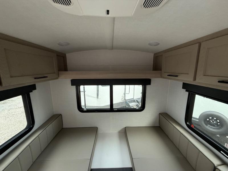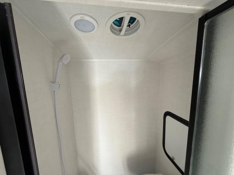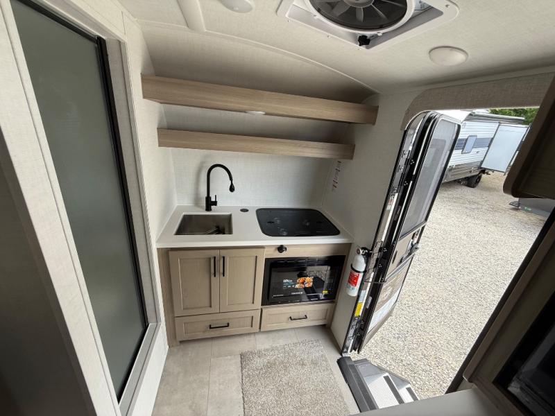 It won't be hard to find comfort in this travel trailer. It may be smaller on size, but it doesn't skim on features. The twin beds convert to a king-size bed for your comfort, and there is even a 32" 12V TV to enjoy in the evenings. The kitchen includes a three burner cooktop, a convection microwave, plus a 12V refrigerator for perishables. You'll find overhead compartments for your valuables and exterior storage for your hiking gear!