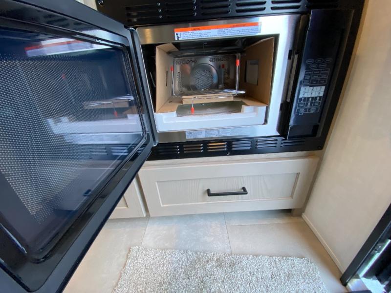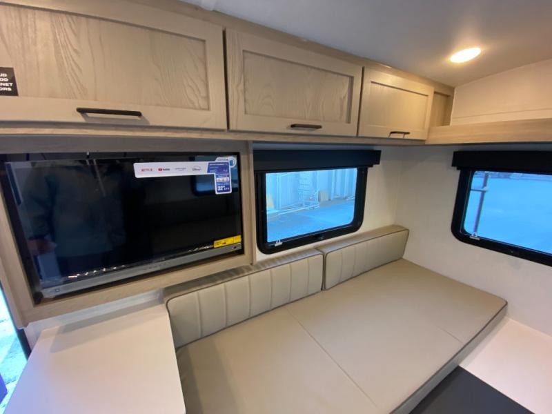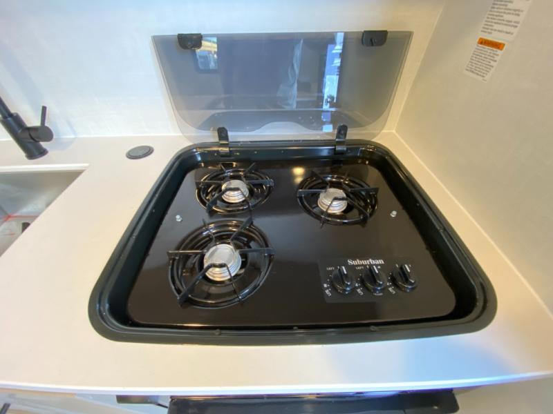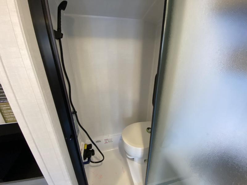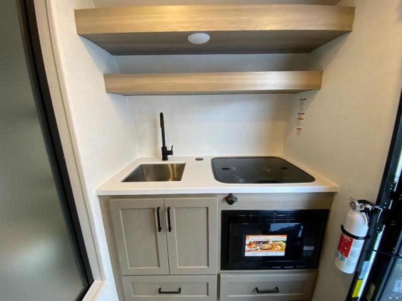 It won't be hard to find comfort in this travel trailer. It may be smaller on size, but it doesn't skim on features. The 30" x 74" twin beds convert to a king-size bed for your comfort, and there is even a 12V TV to enjoy in the evenings. The kitchen includes a three-burner cooktop, a convection microwave, plus a 12V refrigerator for perishables. You'll find overhead compartments for your valuables and storage for your hiking gear!