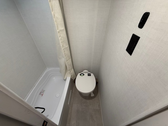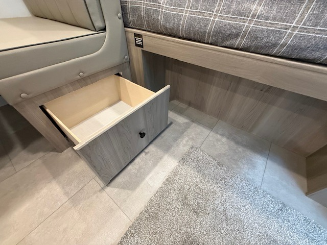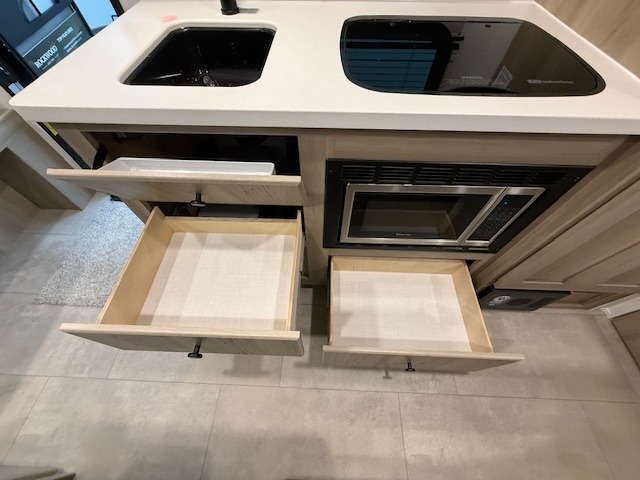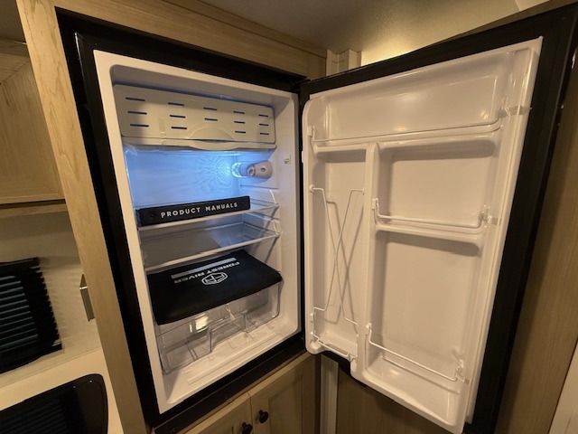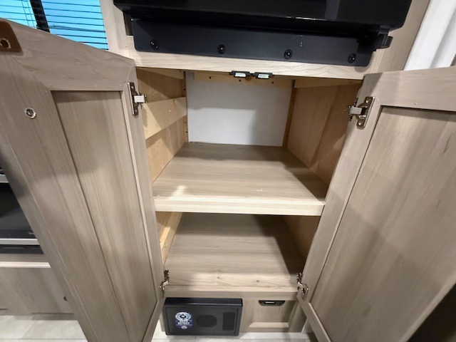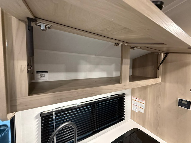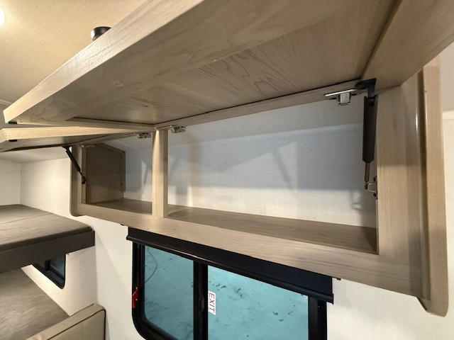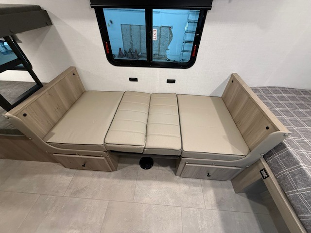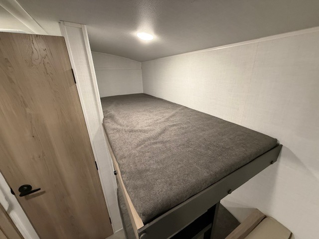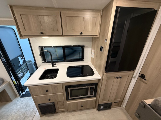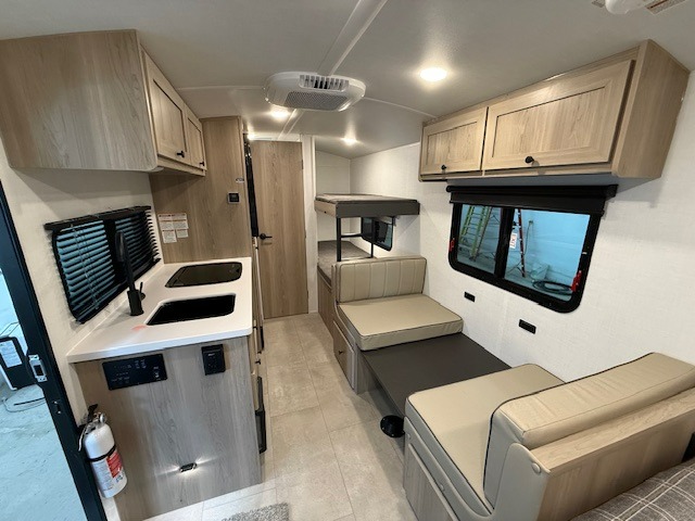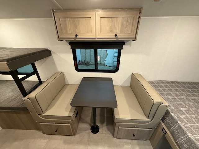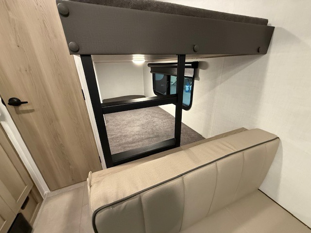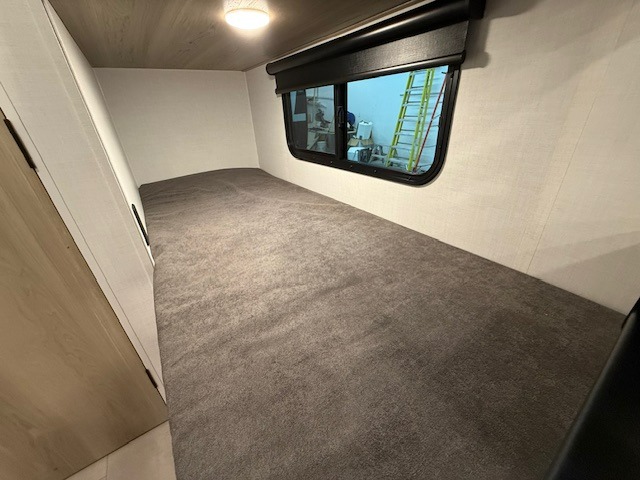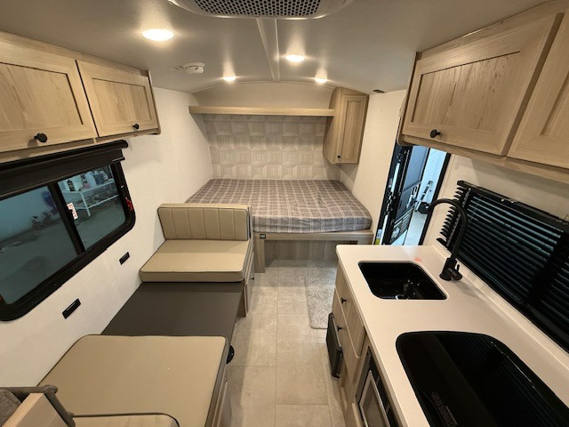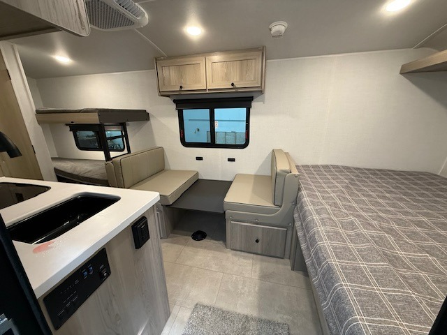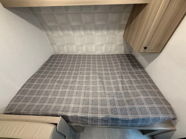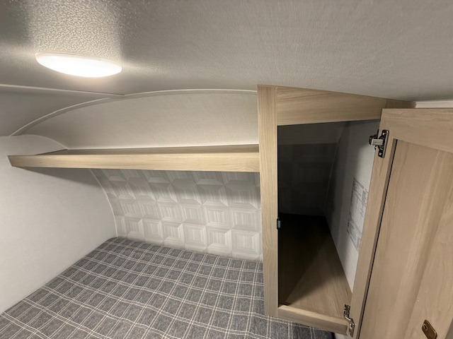 When you enter this compact but mighty trailer, you’re greeted by a comfortable 54" x 80" full bed at the front, complete with a shelf and wardrobe to keep your clothing and essentials neatly organized. To one side sits a cozy 32" dinette, perfect for enjoying a meal or playing a board game after a day of exploring. Across from it, the well-equipped kitchen includes a sink, microwave, and refrigerator everything you need to quickly whip up a meal. One rear corner houses a convenient bathroom with a shower and toilet, giving you the comfort of home without relying on campsite facilities. In the opposite corner, 30" x 74" double bunks provide extra sleeping space so more guests can join the adventure.