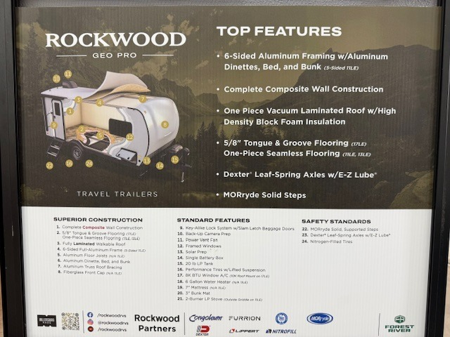 With any Rockwood GEO Pro LE travel trailer by Forest River you will enjoy easy towing, durable construction, and off-road capabilities with a fully laminated roof! Each model is constructed with complete composite wall construction for added strength and durability, and Dexter® axles that will make towing easier than ever. You will also enjoy MORryde Solid, Supported Steps for more stability and security when going inside your travel trailer. Inside, you'll find back up camera prep for added security, plus many other interior amenities that will make you feel at home on the road.