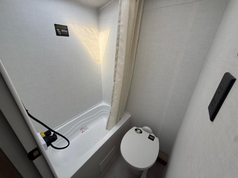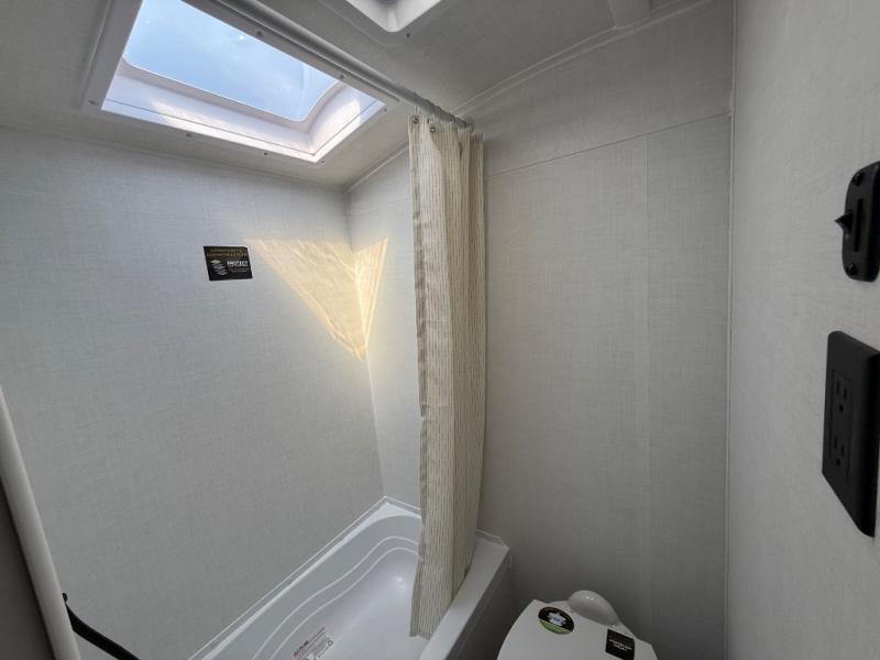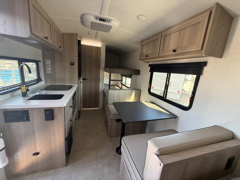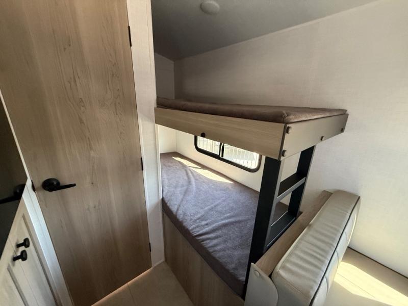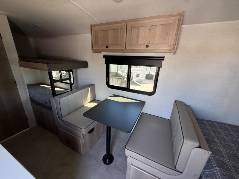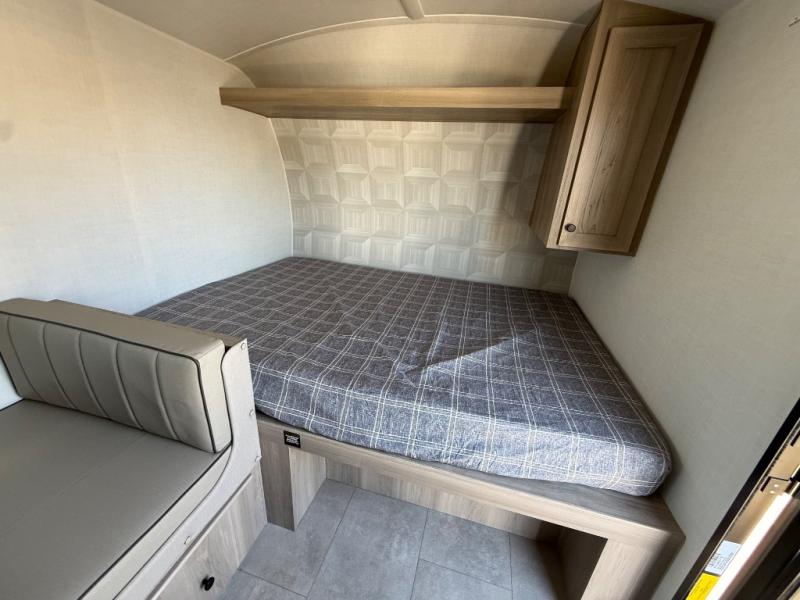 When you enter this compact but mighty trailer, you’re greeted by a comfortable 54" x 80" full bed at the front, complete with a shelf and wardrobe to keep your clothing and essentials neatly organized. To one side sits a cozy 32" dinette, perfect for enjoying a meal or playing a board game after a day of exploring. Across from it, the well-equipped kitchen includes a sink, microwave, and refrigerator everything you need to quickly whip up a meal. One rear corner houses a convenient bathroom with a shower and toilet, giving you the comfort of home without relying on campsite facilities. In the opposite corner, 30" x 74" double bunks provide extra sleeping space so more guests can join the adventure.