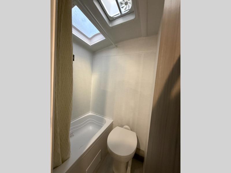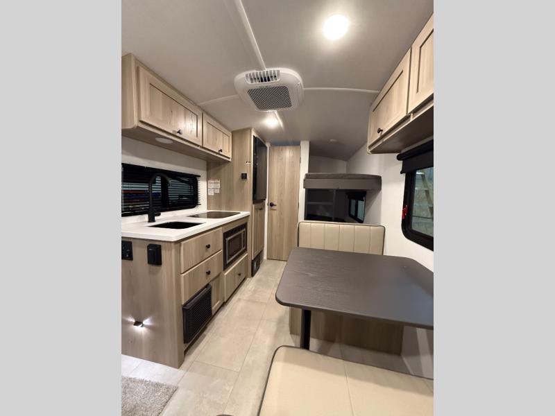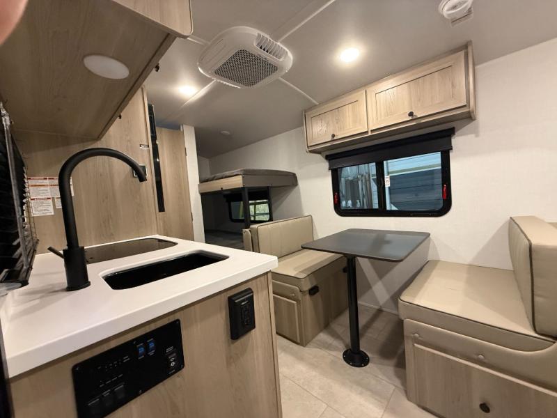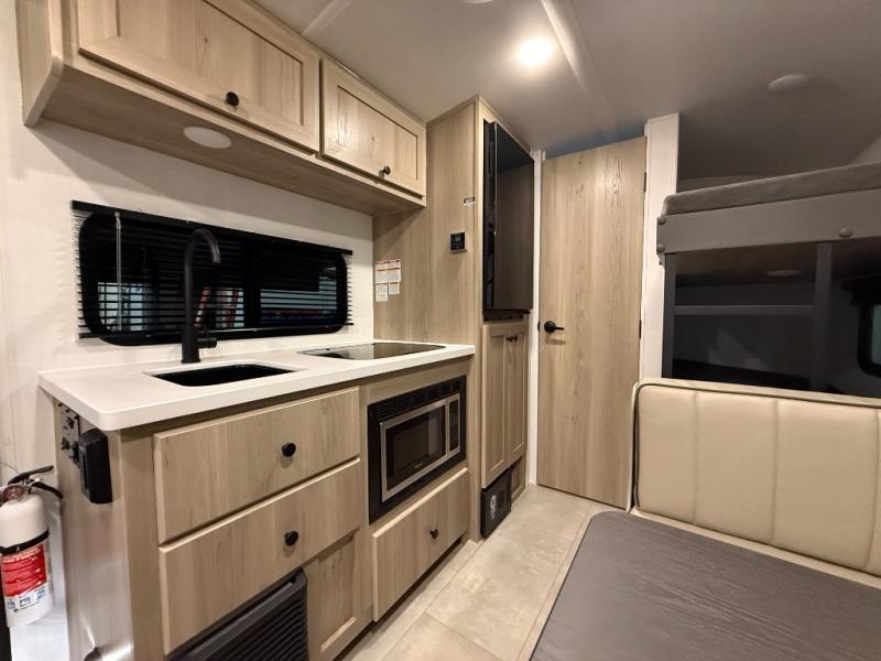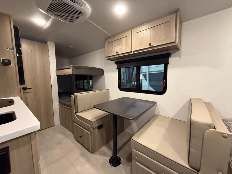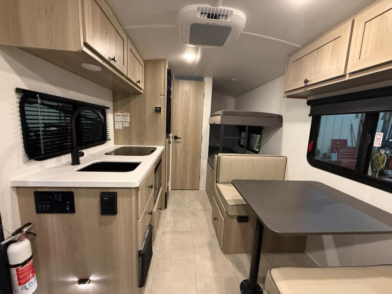 When you enter this compact but mighty trailer, you’re greeted by a comfortable 54" x 80" full bed at the front, complete with a shelf and wardrobe to keep your clothing and essentials neatly organized. To one side sits a cozy 32" dinette, perfect for enjoying a meal or playing a board game after a day of exploring. Across from it, the well-equipped kitchen includes a sink, microwave, and refrigerator everything you need to quickly whip up a meal. One rear corner houses a convenient bathroom with a shower and toilet, giving you the comfort of home without relying on campsite facilities. In the opposite corner, 30" x 74" double bunks provide extra sleeping space so more guests can join the adventure.