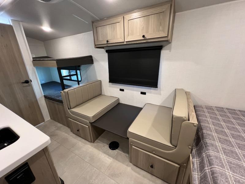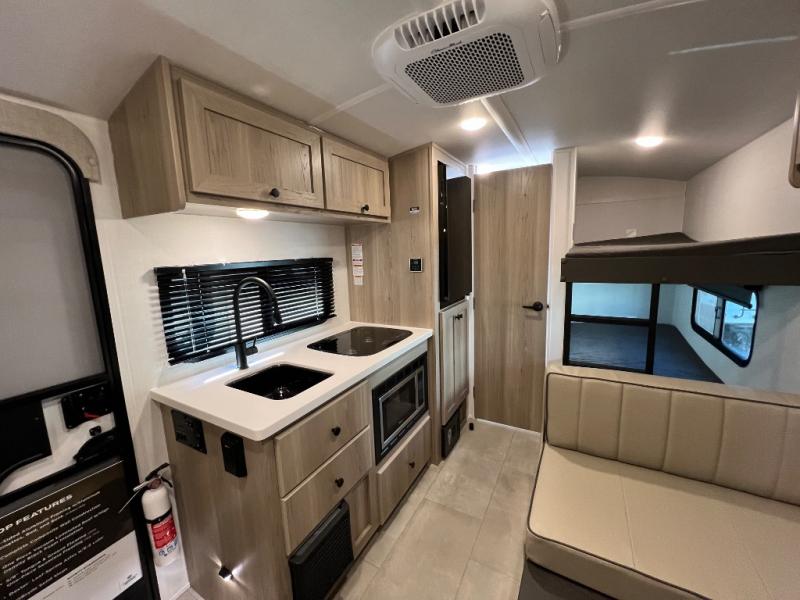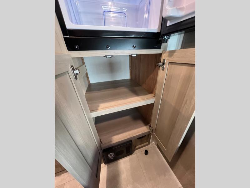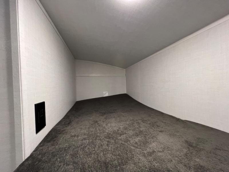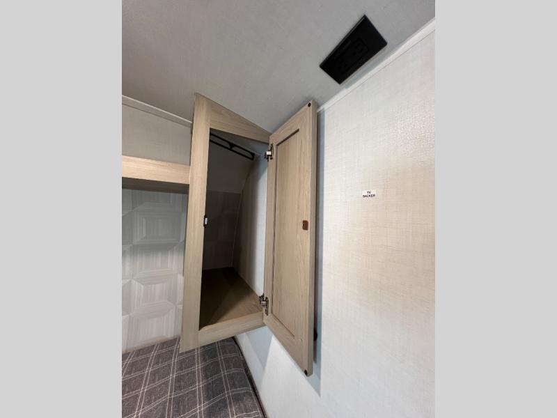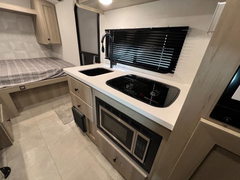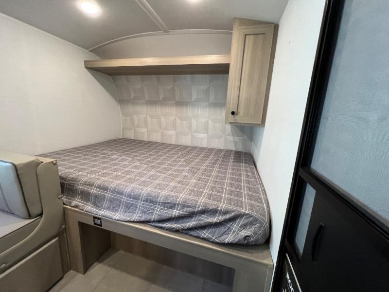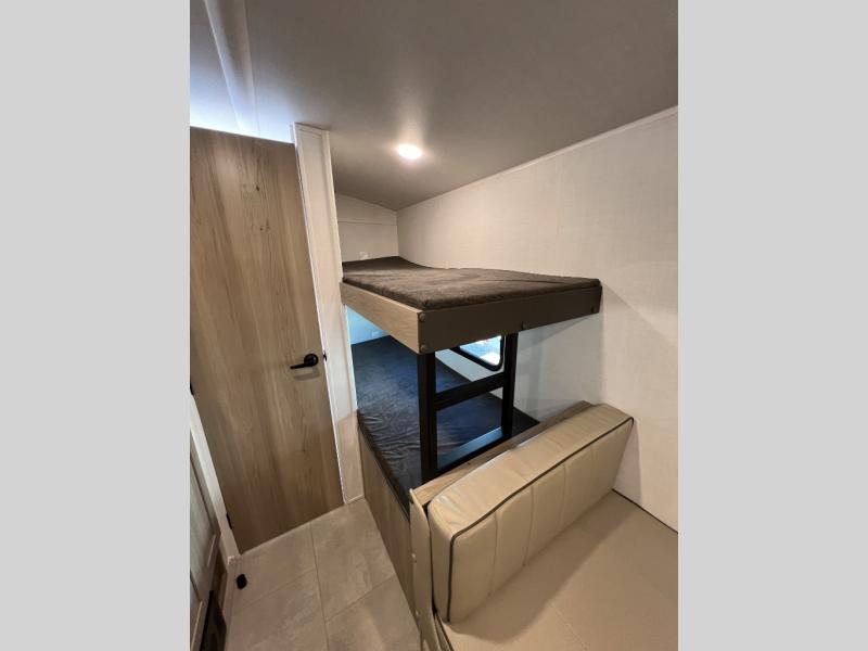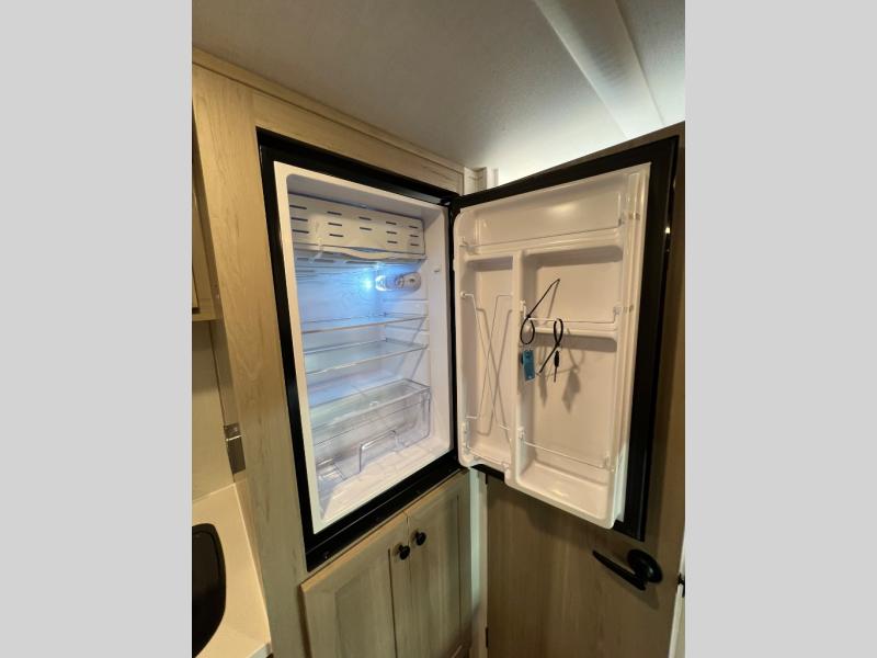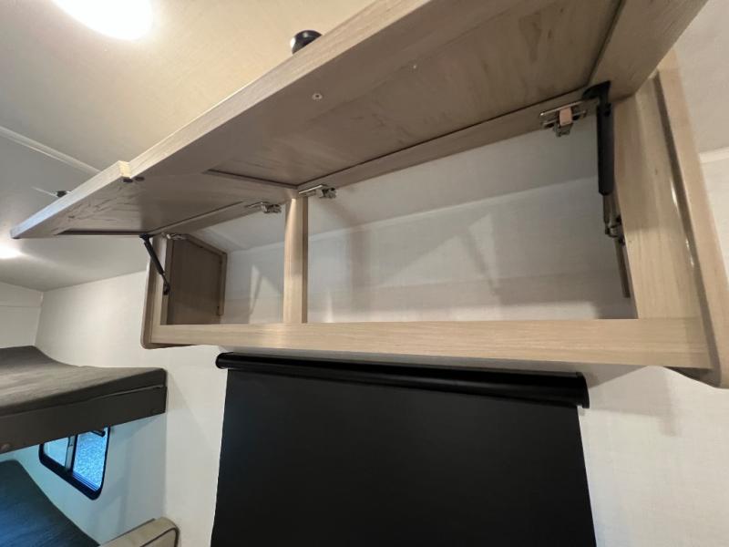When you enter this compact but mighty trailer, you’re greeted by a comfortable 54" x 80" full bed at the front, complete with a shelf and wardrobe to keep your clothing and essentials neatly organized. To one side sits a cozy 32" dinette, perfect for enjoying a meal or playing a board game after a day of exploring. Across from it, the well-equipped kitchen includes a sink, microwave, and refrigerator everything you need to quickly whip up a meal. One rear corner houses a convenient bathroom with a shower and toilet, giving you the comfort of home without relying on campsite facilities. In the opposite corner, 30" x 74" double bunks provide extra sleeping space so more guests can join the adventure.