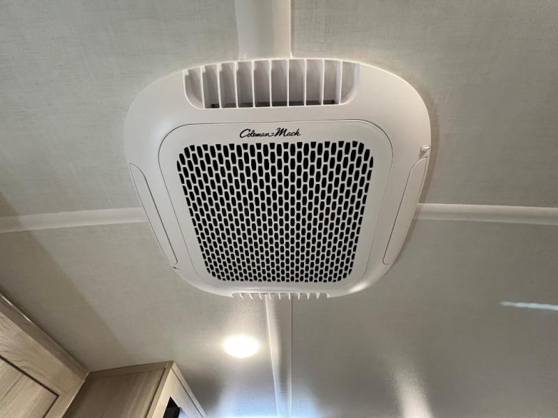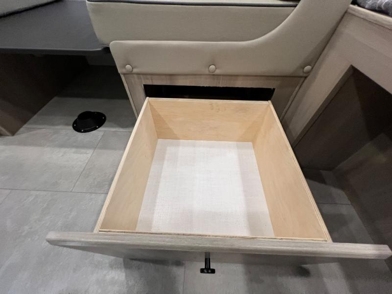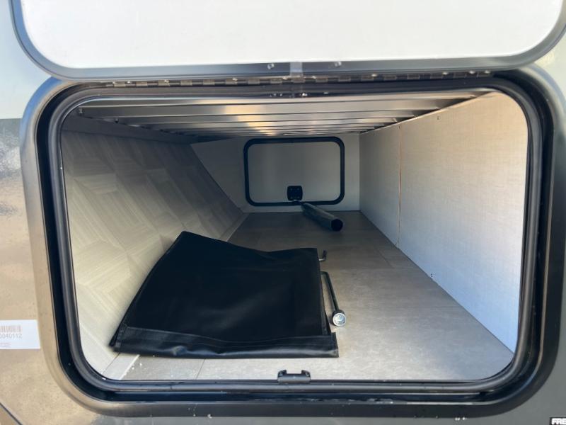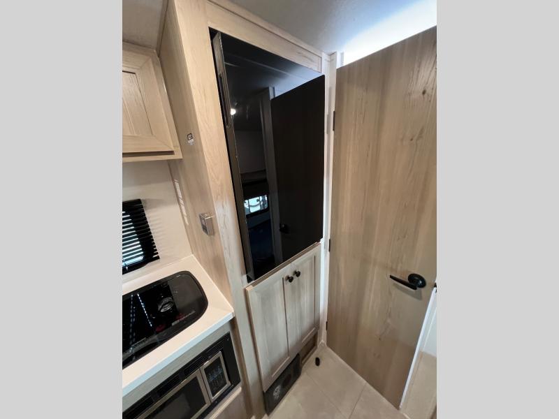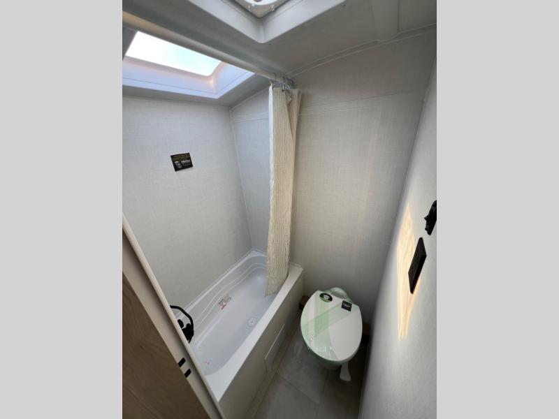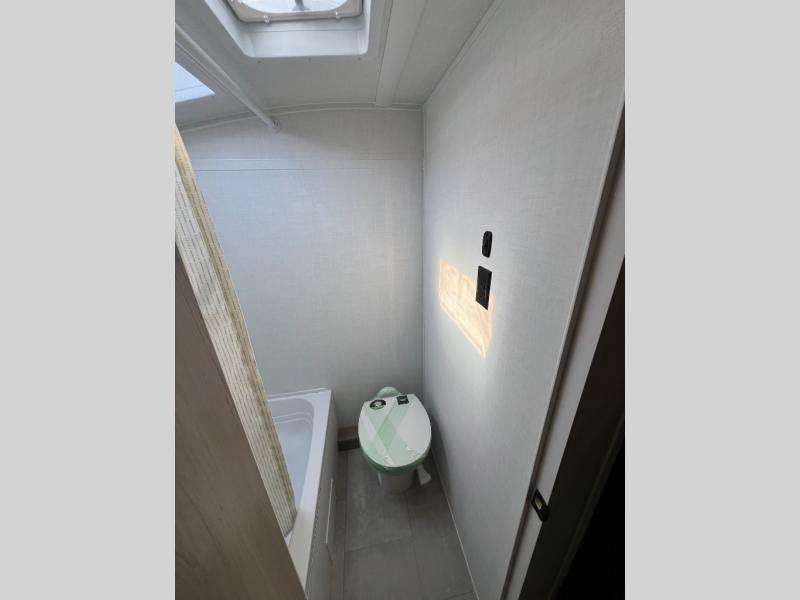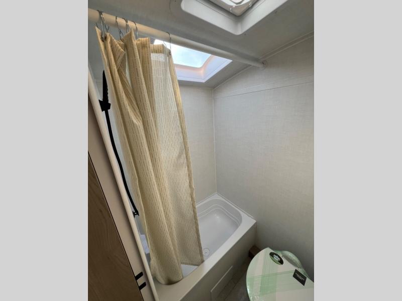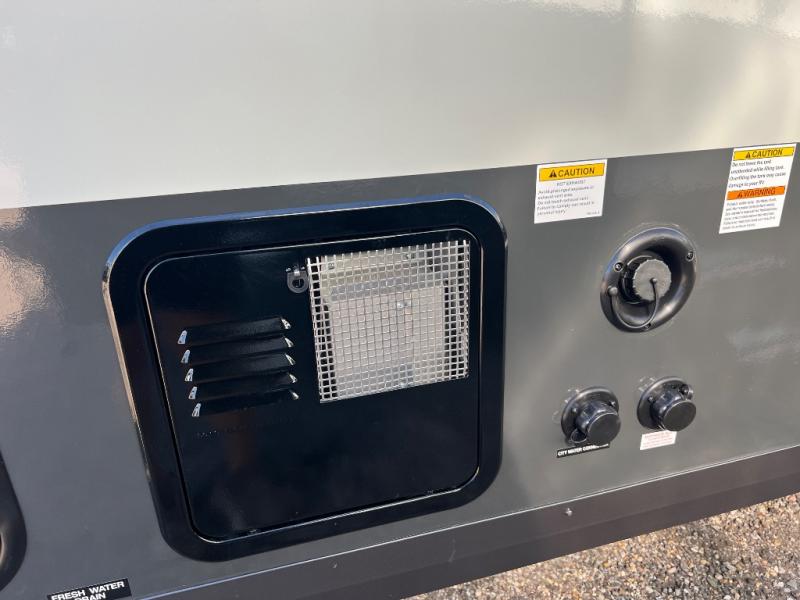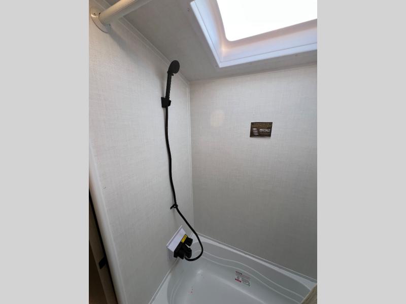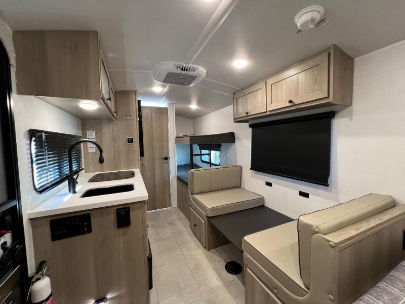 When you enter this compact but mighty trailer, you’re greeted by a comfortable 54" x 80" full bed at the front, complete with a shelf and wardrobe to keep your clothing and essentials neatly organized. To one side sits a cozy 32" dinette, perfect for enjoying a meal or playing a board game after a day of exploring. Across from it, the well-equipped kitchen includes a sink, microwave, and refrigerator everything you need to quickly whip up a meal. One rear corner houses a convenient bathroom with a shower and toilet, giving you the comfort of home without relying on campsite facilities. In the opposite corner, 30" x 74" double bunks provide extra sleeping space so more guests can join the adventure.