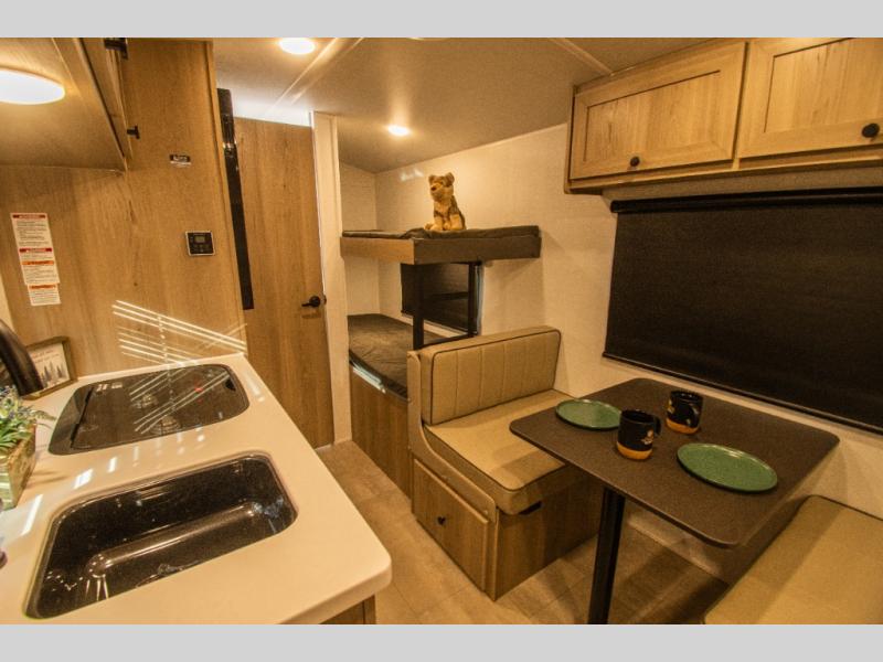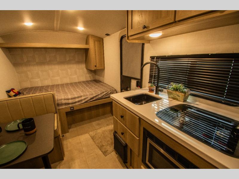 The main living area includes a 32" dinette, creating a cozy spot for meals, games, or relaxing after a day outdoors. Across from the dinette, the kitchen is equipped with a sink, two burner stove, microwave, and refrigerator, giving you everything needed for quick meals and easy campsite cooking. Overhead cabinets throughout the trailer add useful storage for cookware, food, and gear.