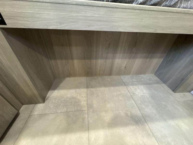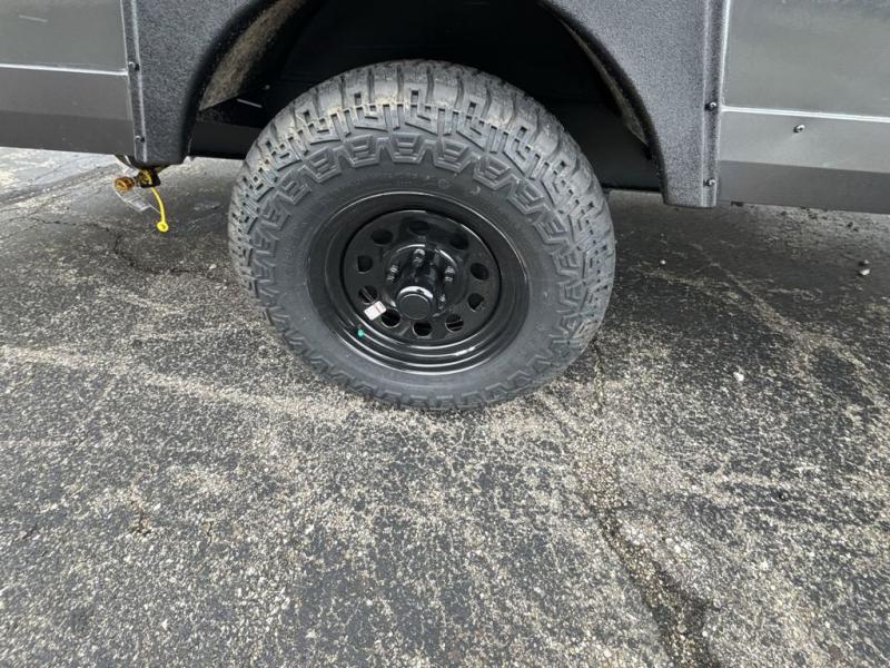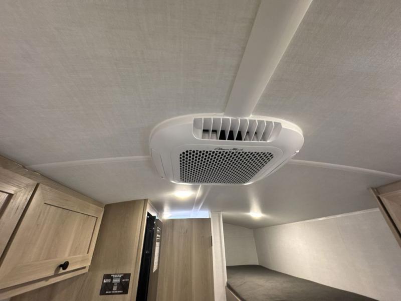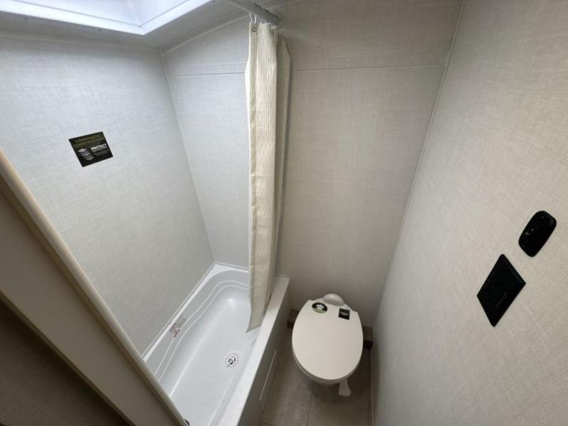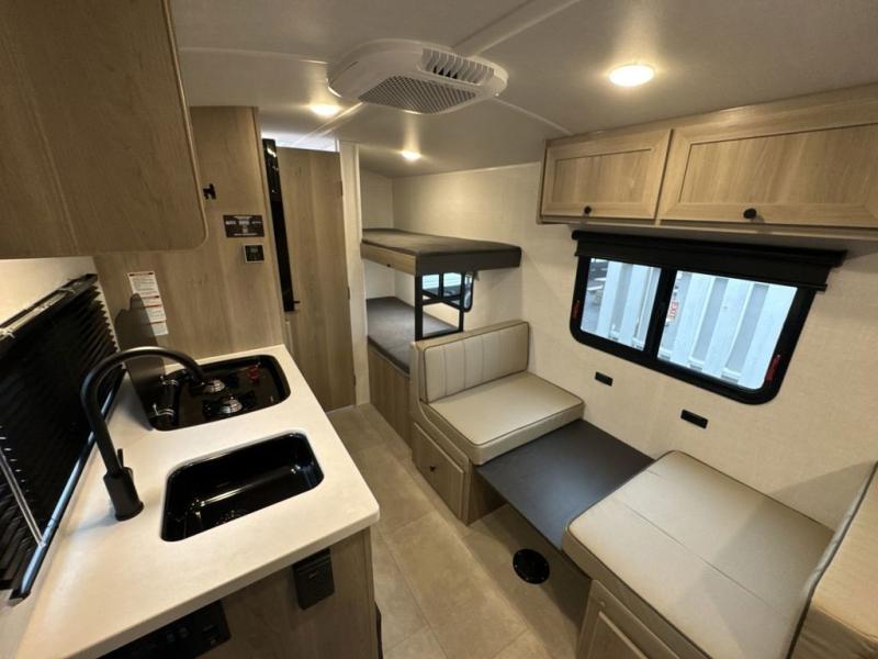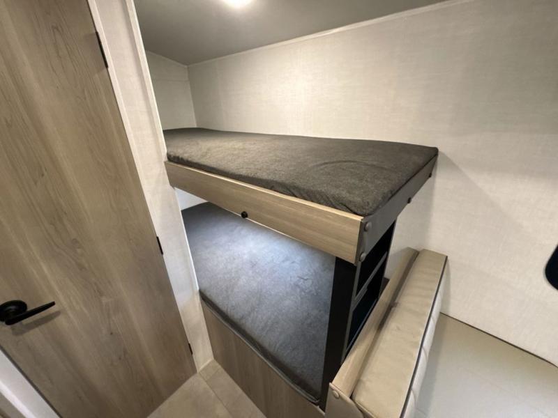When you enter this compact but mighty trailer, you’re greeted by a comfortable 54" x 80" full bed at the front, complete with a shelf and wardrobe to keep your clothing and essentials neatly organized. To one side sits a cozy 32" dinette, perfect for enjoying a meal or playing a board game after a day of exploring. Across from it, the well-equipped kitchen includes a sink, microwave, and refrigerator everything you need to quickly whip up a meal. One rear corner houses a convenient bathroom with a shower and toilet, giving you the comfort of home without relying on campsite facilities. In the opposite corner, 30" x 74" double bunks provide extra sleeping space so more guests can join the adventure.